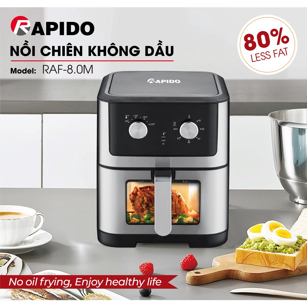 Nồi chiên không dầu Rapido RAF 8.0M có dung tích lên đến 8L, kích thước lòng nồi rộng 25,5cm, chiên nướng được gà nguyên con 2 – 3 kg.