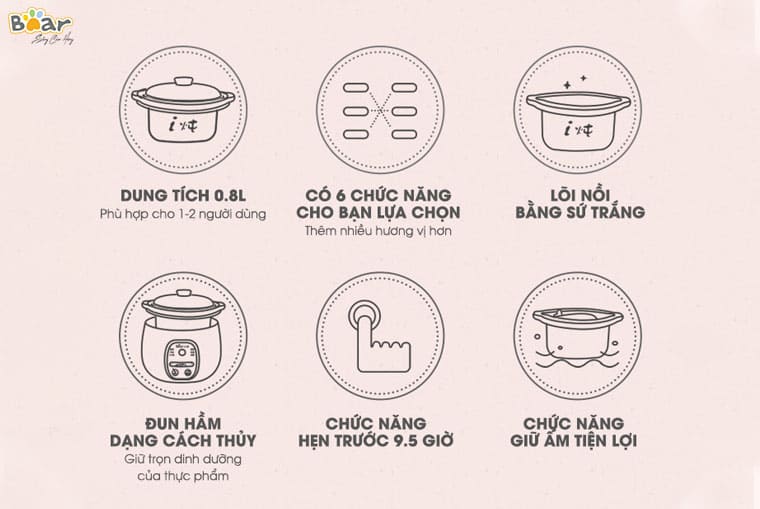 Mua tại TiktokNồi nấu chậm 0.8L Bear DDZ-B08C1 (SUBE001) phiên bản quốc tế với 6 tính năng nấu thông minh, tích hợp bảng điều khiển tiếng anh, hướng dẫn tiếng việt và chân cắm 2 chấu phù hợp với ổ cắm tại Việt Nam. Sở hữu nhiều ưu điểm nồi bật về tính năng và thiết kế nồi nấu cháo chậm Bear quốc tế chắc chắn mang đến cho bạn những trải nghiệm tốt nhất. Nồi nấu chậm nhỏ gọn - đẹp mắt Không chỉ sở hữu nhiều tính năng hiện đại nồi nấu chậm Bear 0.8L còn có thiết kế nhỏ gọn vô cùng bắt mắt. Kết cấu nồi bao gồm 1 thố sứ nhỏ nấu cháo 0,8 lít, 1 vỏ nồi chất liệu ABS với tông màu sáng, 1 lồng hấp dung tích 1 lít dùng để hấp rau củ và bánh bao trong lúc nấu cháo siêu tiện lợi. Mặc dù có thiết kế nhỏ gọn nhưng với dung tích nồi nấu cháo chậm 0,8 lít thì Bear DDZ-B08C1 (SUBE001) vẫn thích hợp sử dụng cho bé yêu của bạn, nấu từ 1-2 bữa ăn trong ngày cho bé tùy vào giai đoạn tuổi của bé. Không chỉ thích hợp dùng để nấu cháo, dung tích nồi còn phù hợp làm món hầm, hấp với lượng thức ăn ít, phù hợp cho 1-2 người ăn. Thiết kế nồi nấu cháo Bear từng chi tiết tháo rời rất tiện lợi cho việc vệ sinh và cất giữ sau khi sử dụng. Đặc biệt, bề mặt nồi nấu cháo chậm có thiết kế dạng nhẵn bóng, chống bám bẩn và dễ lau chùi hơn. Nồi nấu cháo Bear đa năng - hấp hầm trong 1 Sở hữu thiết kế 2 tầng thông minh bạn có thể cùng lúc nấu món hấp và hầm với em nồi nấu cháo chậm 0,8 lít của nhà Bear nhé. Từ giờ trong lúc nấu cháo cho bé yêu mẹ có thể hấp thêm rau củ, khoai hoặc ngô cho bé tập ăn dặm, có một bữa ăn đầu đủ dinh dưỡng mà lại siêu tiết kiệm thời gian. Đặc biệt, nồi nấu chậm Bear bản quốc tế loại 0,8 lít còn được tích hợp đến 6 chức năng nấu thông minh: nấu cháo, hầm canh, hấp/luộc, hầm tổ yến, nấu chè và chế độ nấu tự động. Chỉ với một em nồi nhỏ gọn này bạn có thể chế biến đồ ăn cho bé theo nhiều kiểu khác nhau hoặc làm các món ăn khác trong gia đình vẫn vô cùng tiện lợi. Chất liệu cao cấp - an toàn cho bé Chất liệu nồi nấu cháo chậm Bear vô cùng lành tình cho bé yêu và đảm bảo an toàn cho mẹ khi sử dụng. Lõi nồi làm bằng sứ trắng cao cấp đảm bảo không có phản ứng hóa học khi sinh nhiệt hay tiếp xúc với thức ăn, thân nồi và lồng hấp được làm bằng nhựa ABS chịu nhiệu đảm bảo an toàn về cách điện khi sử dụng, nhựa cao cấp không chứa hay thôi ra chất độc hại khi sử dụng. Trong trường hợp lõi sứ bị hư hỏng hay rơi vỡ bạn hoàn toàn có thể liên hệ với Bear Việt Nam để mua bổ sung phụ kiện lõi sứ nồi nấu chậm Bear nhé cả nhà. Bear Việt Nam ngoài việc cung cấp thông tin hướng dẫn sử dụng nồi nấu cháo chậm Bear còn chuẩn bị mọi phụ kiện để phục vụ nhu cầu phát sinh trong quá trình sử dụng sản phẩm của bạn. Phương pháp nấu cách thủy giữ trọn dưỡng chất Điểm đặc biệt của nồi nấu cháo chậm Bear so với các loại nồi nấu cháo chậm khác trên thị trường đó chính là sử dụng phương pháp nấu cách thủy. Ưu điểm của việc nấu cách thủy là giúp thức ăn chín từ từ, không bị biến đổi chất, không bị bay hơi mất chất dinh dưỡng trong quá trình nấu. Vì vậy, với em nồi nấu chậm Bear cách thủy cả nhà hoàn toàn có thể yên tâm về việc bé yêu có một bữa ăn giàu dinh dưỡng mỗi ngày nhé. Hẹn giờ nấu lên đến 9,5 giờ tiện lợi Nồi nấu chậm Bear 08 DDZ-B08C1 còn được tích hợp tính năng hẹn giờ nấu thông minh từ 1 tiếng đến 9,5 tiếng. Với tính năng hẹn giờ dài và tự động chuyển sang chế độ giữ ấm khi nấu xong, mẹ có thể chuẩn bị cháo cho bé từ tối hôm trước và chọn chế độ nấu hẹn giờ, sáng hôm sau không cần dậy sớm tất bật mà bé yêu vẫn có món cháo bổ dưỡng. Nếu bạn là một bà mẹ bận rộn thì em nồi nấu cháo đa năng Bear SUBE001 này là lựa chọn hoàn hảo dành cho bạn. Ngoài chế độ tự động giữ ấm 3 giờ sau khi nấu xong bạn cũng có thể tự động điều chỉnh thời gian giữ ấm thủ công với em nồi nấu cháo Bear này nhé. Chỉ với 1 thao tác đơn giản bé yêu luôn có cháo nóng để thưởng thức cho bữa kế tiếp. Hướng dẫn sử dụng nồi nấu cháo chậm Bear Cách sử dụng nồi nấu cháo chậm Bear vô cùng đơn giản và dễ dàng nhé. Để có một món ăn hoàn hảo bạn chỉ cần làm theo 3 bước sau đây: Bước 1: Cho nước sạch vào thân nồi nấu chậm Bear, lưu ý không đổ nước quá vạch max. Bước 2: Cho thực phẩm và gia vị vào lõi sứ, nêm nếm vừa ăn rồi đặt vào nồi nhé. Bước 3: Ấn chọn chế độ nấu và thời gian nấu, sau 5 giây nồi sẽ tự động chuyển sang chế độ nấu mà bạn lựa chọn. Sau đó bạn chỉ cần theo dõi thời gian nấu trên nồi kết thúc là thức ăn sẽ chín đều và bỏ ra tô để thưởng thức nhé. Tích hợp bảng điều khiển tiện lợi Nồi nấu cháo chậm Bear phiên bản quốc tế được tích hợp bảng điều khiển tiếng anh kè
