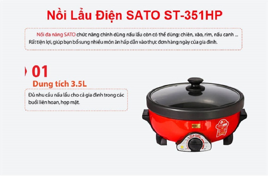 - Nồi Lẩu Điện SATO ST-351HP (3.5L) - Đỏ dùng để nấu lẩu, chiên, xào, rim và nấu canh, giúp bạn bổ sung nhiều món ngon vào thực đơn của gia đình. - Lòng nồi được làm từ nhôm