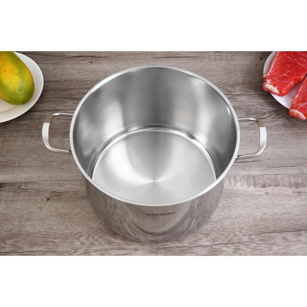 Nồi luộc gà inox 3 đáy SUNHOUSE SH28LG được làm bằng chất liệu inox cao cấp, không bị oxy hóa, kiểu dáng đẹp mắt, vung kính trong suốt, quai núm bằng inox bền đẹp, không han gỉ. Sản phẩm dùng được được trên mọi loại bếp và đáp ứng tốt nhu cầu sử dụng tại gia đình. Bạn sẽ dễ dàng luộc gà, vịt nguyên con mà không cần phải mất công chặt nhỏ. THIẾT KẾ: Chất liệu inox cao cấp, đẹp mắt Sản phẩm có kiểu trang nhã, đẹp mắt, thiết kế tiện lợi để sử dụng tại gia đình. Với chất liệu inox cao cấp, thân nồi không bị han gỉ hay oxy hóa nên rất an toàn với sức khỏe người dùng. Bề mặt của nồi sáng bóng, dễ dàng lau chùi, vệ sinh. Vung kính cường lực Nồi lẩu inox 1 đáy SUNHOUSE SH28LG có vung kính cường lực, dày 4mm, trong suốt, giúp bạn dễ dàng quan sát thực phẩm bên trong nồi. Quai núm bằng inox bền đẹp Quai núm được làm bằng inox chịu nhiệt, bền đẹp, không han gỉ. Quai nồi được hàn chặt với thân nồi, vừa tăng tính thẩm mỹ vừa đảm bảo khả năng chịu lực tốt. Bạn sẽ rất dễ nâng nhấc và di chuyển nồi trong quá trình sử dụng.   CÔNG NĂNG: Đáy nồi hấp thụ nhiệt nhanh, tiết kiệm nhiên liệu Sản phẩm có cấu tạo đáy 3 lớp nên có khả năng truyền nhiệt nhanh và giữ nhiệt tốt để làm chín đều thực phẩm bên trong, từ đó giúp bạn tiết kiệm nhiên liệu cũng như thời gian luộc gà.