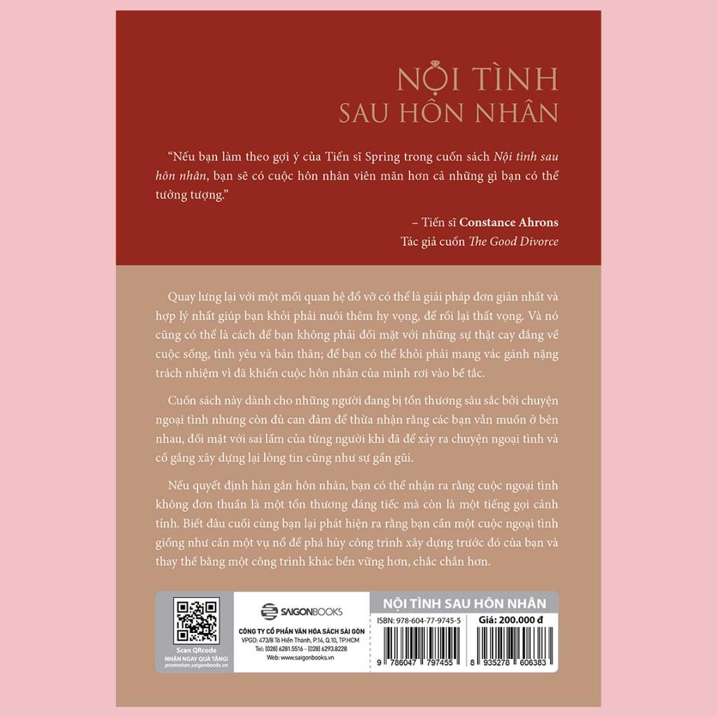 NỘI TÌNH SAU HÔN NHÂN Buông bỏ hay hàn gắn khi nửa kia ngoại tình? Tình trạng ngoại tình và ly hôn đã trở nên đáng báo động Nếu như bạn là một người hay đọc báo, lướt mạng xã hội thì chắc hẳn bạn bắt gặp không ít các loại tin đánh ghen, ngoại tình, người thứ ba. Theo số liệu của Tổng cục Thống kê, trong 10 năm qua, tỷ lệ các cặp vợ chồng ly hôn luôn tăng dần qua các năm và ngày càng trẻ hóa. Với không ít người trong xã hội hiện nay, họ nghĩ chuyện ngoại tình không sai và luôn có lý do để giải thích. Nhưng trong mỗi cuộc hôn nhân, dù ngoại tình có đáng trách hay không, thì việc tiếp tục ngoại tình mà không có sự đồng thuận của cả hai bên sẽ khiến hôn nhân rạn nứt và hai vợ chồng hầu như không thể gắn bó với nhau được nữa. Như thế nào là ngoại tình? Trước khi bàn luận sâu hơn, Tiến sĩ Janis Abrahms Spring và Michael Spring đã đặt ra các câu hỏi cho chính bạn: Ngoại tình nghĩa là quan hệ tình dục? Hay chỉ cần một nụ hôn? Thế còn những buổi hẹn hò ăn uống cùng nhau thì sao? Trong lần ấn bản thứ ba này, tác giả có bổ sung thêm một chương về những thử thách trong mối quan hệ mà các đợt ấn bản trước chưa đề cập tới. Phần này được kể lại một số tình huống mà một số người đã phải vật vã tự đấu tranh, kèm theo những đề xuất cụ thể của nhà tâm lý, Tiến sĩ Spring để giúp họ xoa dịu nỗi đau. Nội tình sau hôn nhân - “công cụ” hữu ích cho mọi cuộc hôn nhân rạn nứt vì ngoại tình Cuốn sách này sẽ đem lại cái nhìn sâu sắc về lý do dẫn đến chuyện ngoại tình, ảnh hưởng của ngoại tình đến cả hai người trong hôn nhân, dù là người bị tổn thương hay người không chung thủy.