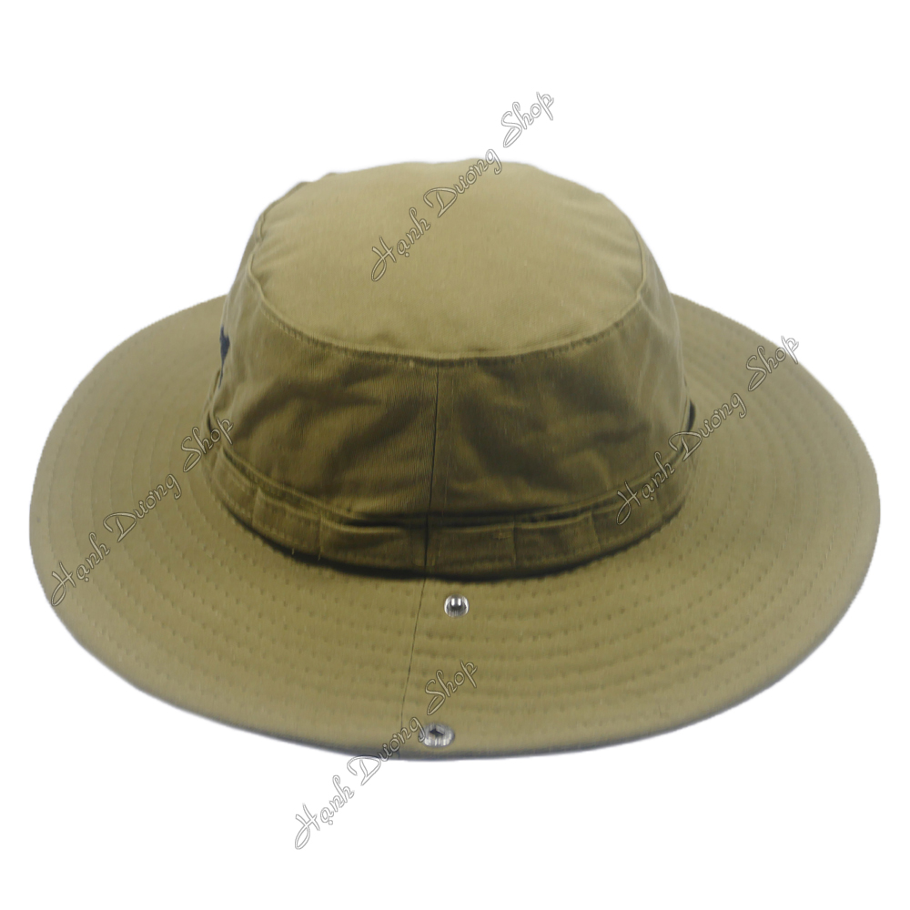 Vải Kaki dày dặn nhưng không nóng vì là 100%cotton. Có dây đeo không lo gió bay. Nút bấm kim loại 2 bên vành nón để bẻ lên cho ngầu luôn. Shop nhận thêu logo