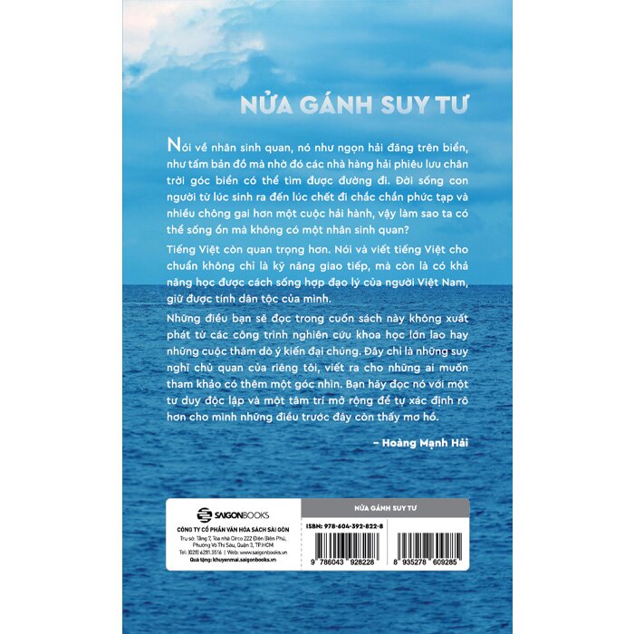 Nửa Gánh Suy Tư - Hành Trình Trở Thành Một Người Có Giá Trị "Nửa Gánh Suy Tư" là hành trình sâu sắc khám phá giá trị nhân sinh, tư duy và tiếng Việt. Tác giả Hoàng Mạnh Hải, qua hơn một thập kỷ học hỏi và chiêm nghiệm, đã mang đến những trang viết đầy ý nghĩa, giúp độc giả tìm thấy ánh sáng tri thức trong hành trình sống của chính mình. Cuốn sách “Nửa gánh suy tư”được chia thành hai phần chính: Phần 1: Nhân Sinh Quan Phần này tập trung vào việc xây dựng và hiểu rõ nhân sinh quan - cách chúng ta nhìn nhận cuộc sống. Qua từng chương, tác giả dẫn dắt độc giả đi từ những ý niệm cơ bản về nhân sinh, triết lý sống, đến việc thực hành cụ thể. Đặc biệt, tác giả giới thiệu hành trình "30 ngày tìm kiếm nhân sinh quan", một lộ trình giúp mỗi cá nhân định hình giá trị sống của mình một cách rõ ràng và sâu sắc. Những triết lý lớn như Khổng giáo, Thiên Chúa giáo, Phật giáo, và những giá trị nhân văn của lương tri được đan xen, giúp người đọc có cái nhìn toàn diện và cân bằng. Tác giả cũng nhấn mạnh rằng nhân sinh quan không bất biến, nó có thể thay đổi theo thời gian và trải nghiệm của mỗi người. Phần 2: Chuyện Sử Dụng Tiếng Việt Tiếng Việt, với tác giả, không chỉ là một ngôn ngữ giao tiếp mà còn là bản sắc văn hóa, là linh hồn của dân tộc. Phần này đề cập đến những lỗi phổ biến khi sử dụng tiếng Việt, từ việc thiếu từ vựng, ghép từ cẩu thả, đến việc đặt câu tối nghĩa. Đồng thời, tác giả cũng chia sẻ quan điểm của mình về cách dạy và học môn Văn, nhấn mạnh tầm quan trọng của việc giữ gìn sự trong sáng và chuẩn mực của tiếng Việt. “Nửa gánh suy tư” cùng những trăn trở của tác giả "Nửa Gánh Suy Tư" không phải là một công trình nghiên cứu hàn lâm, mà là những chia sẻ chân thực và gần gũi từ một người đã trải nghiệm sâu sắc cuộc sống. Đây là cuốn sách dành cho bất kỳ ai muốn nhìn nhận lại cuộc đời, tìm kiếm ý nghĩa sống, và trân trọng vẻ đẹp của ngôn ngữ mẹ đẻ.
