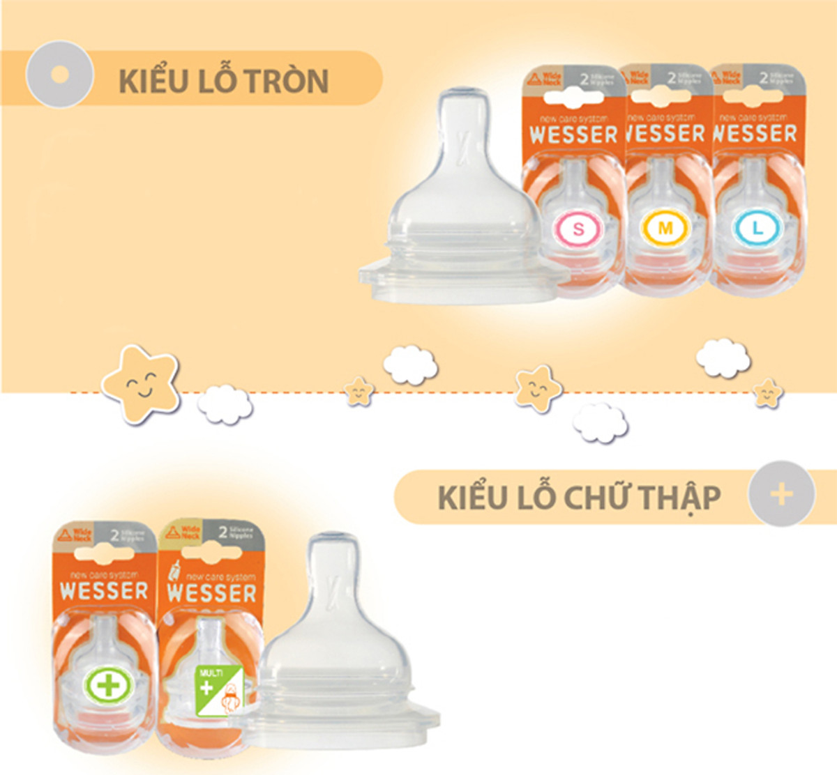 Giới thiệu Núm ty cổ hẹp Wesser ngoài chất liệu silicone siêu mềm kết hợp với hệ thống lỗ kiểm soát sữa vừa đủ với từng giai đoạn phát triển của trẻ giúp vừa chống tắc,