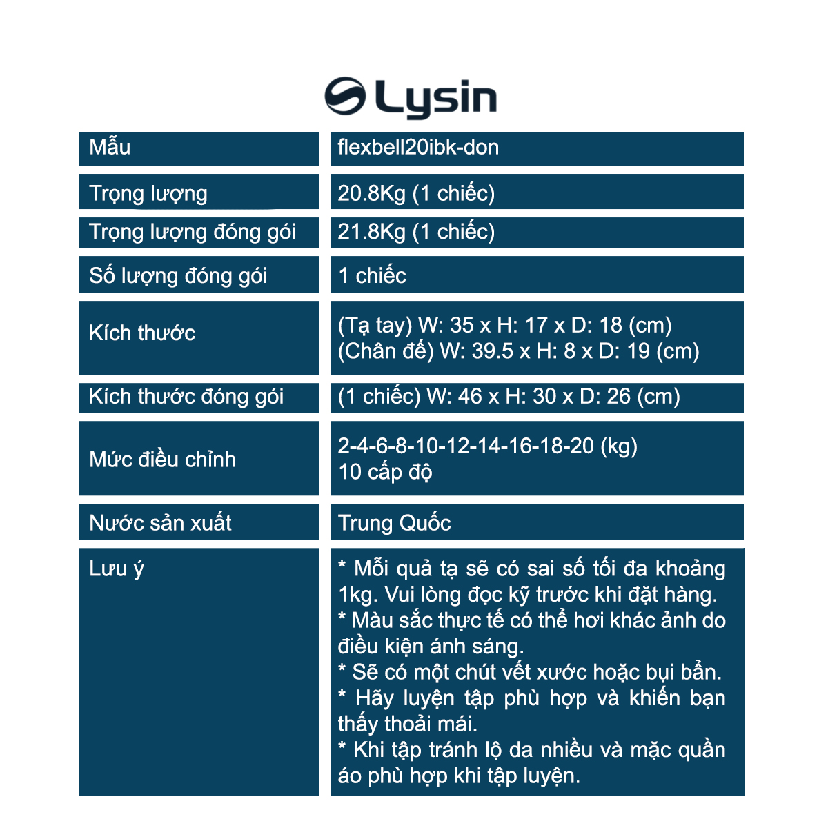 Thông tin tạ tay điều chỉnh 20 Kg - Tạ tay điều chình 20 Kg được thiết kế chắc chắn, với tính thẩm mỹ cao. Có kèm đế đỡ tiện lợi, tránh gây trầy xước cho tạ.
