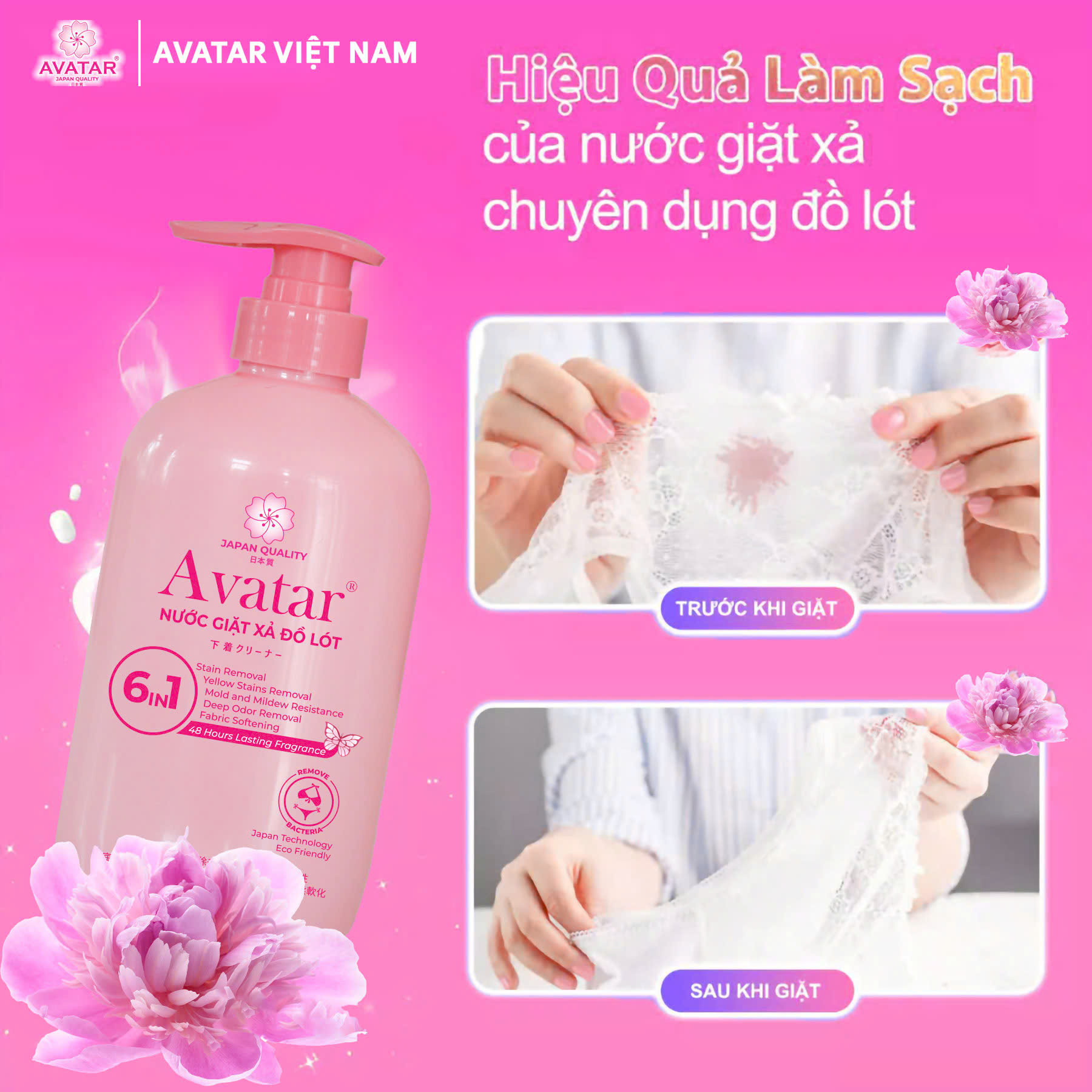 NƯỚC GIẶT XẢ CHUYÊN DỤNG CHO ĐỒ LÓT AVATAR Thương hiệu: Avatar Xuất xứ: Việt Nam theo công nghệ Nhật Bản Mùi hương: Hoa anh đào ngọt ngào Dung tích thực: 500ml HSD: 3 năm