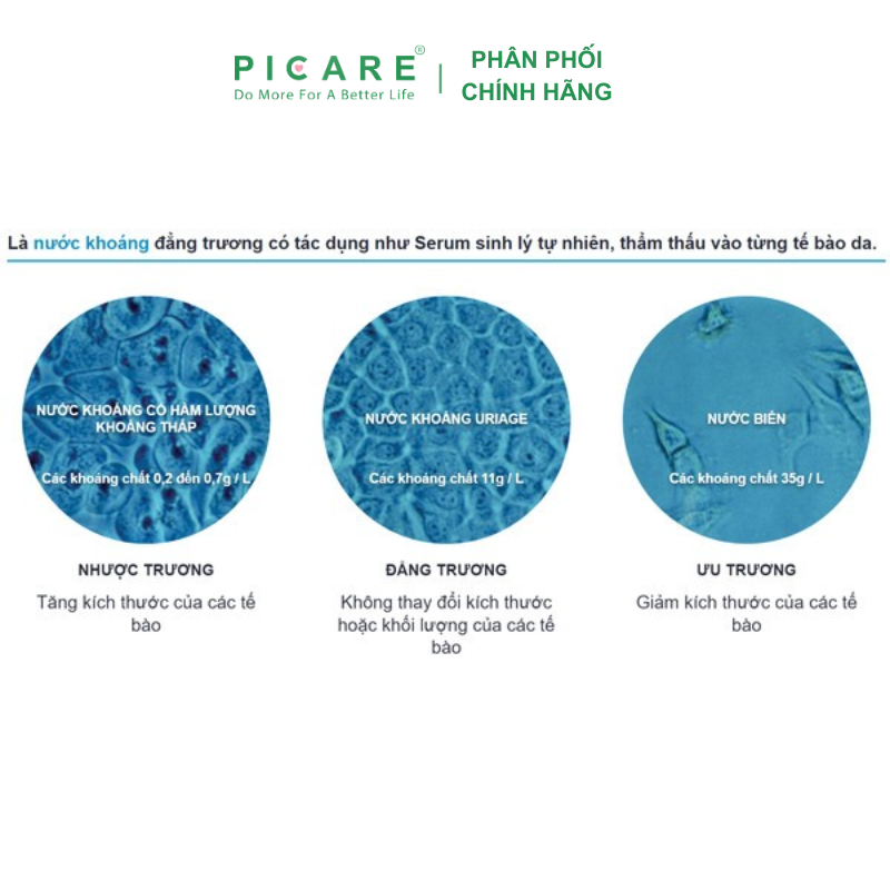 - Nước khoáng Uriage có tính chất Isotonic (đồng áp suất thẩm thấu), có nghĩa là nước khoáng Uriage có khả năng thẩm thấu cùng với áp suất của cơ thể, giúp cho các khoáng chất được thẩm thấu sâu nhanh hơn các dạng xịt khoáng khác.