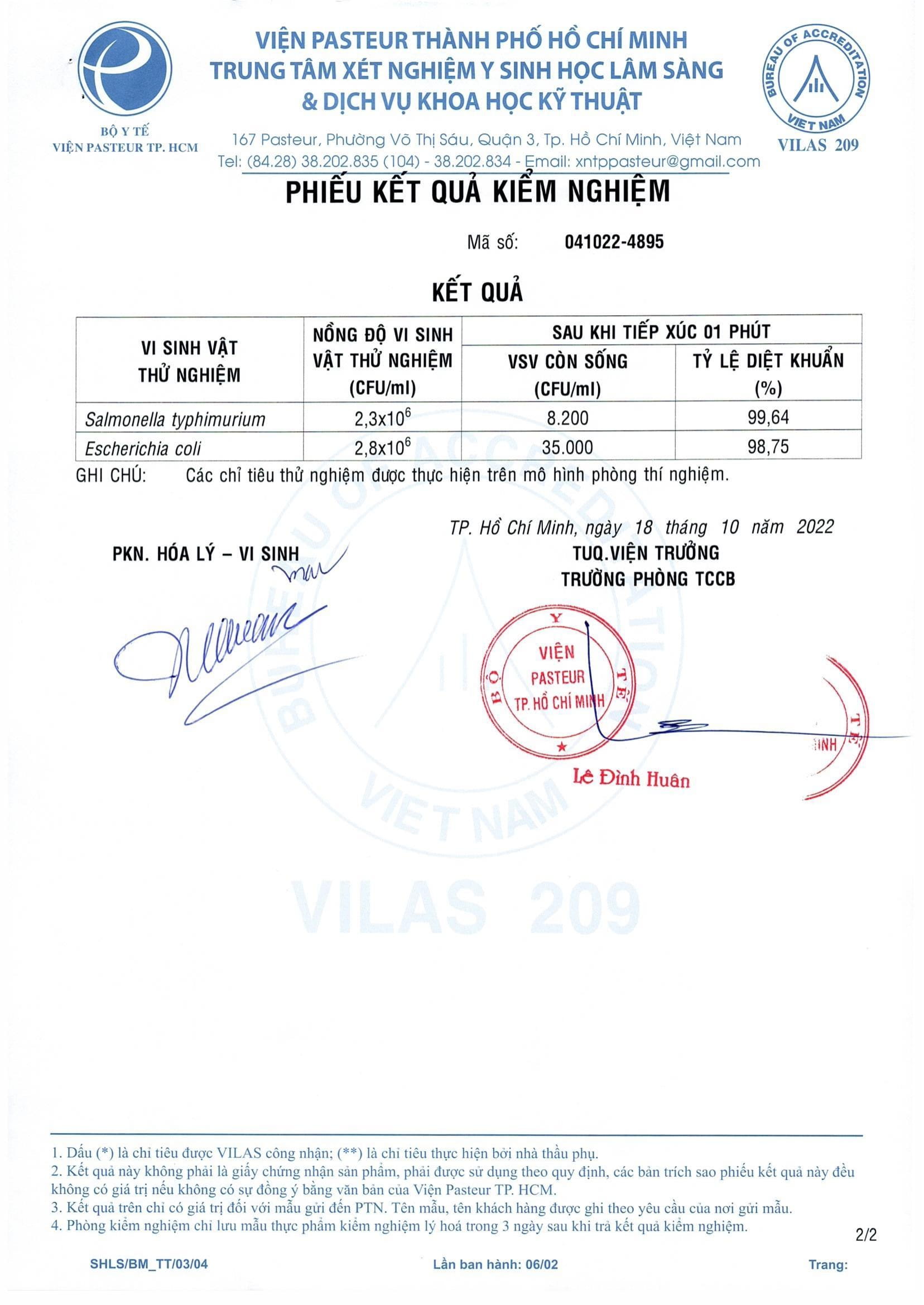 - Diệt 99% vi khuẩn trong 1 phút đã được Viện Pasteur chứng nhận.