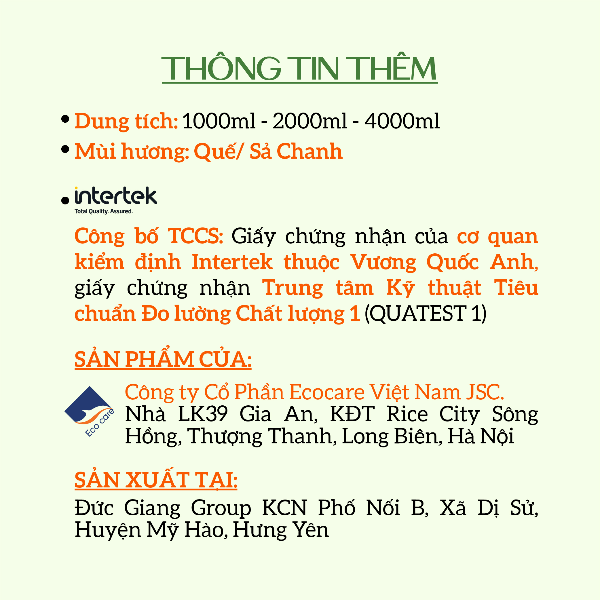 - Sản phẩm được sản xuất bởi công ty Ecocare Việt Nam với thành phần 99% tự nhiên, nguồn gốc thực vật. Vùng nguyên liệu tuyển chọn khắt khe đặt tại nhiều tỉnh thành của Việt Nam.