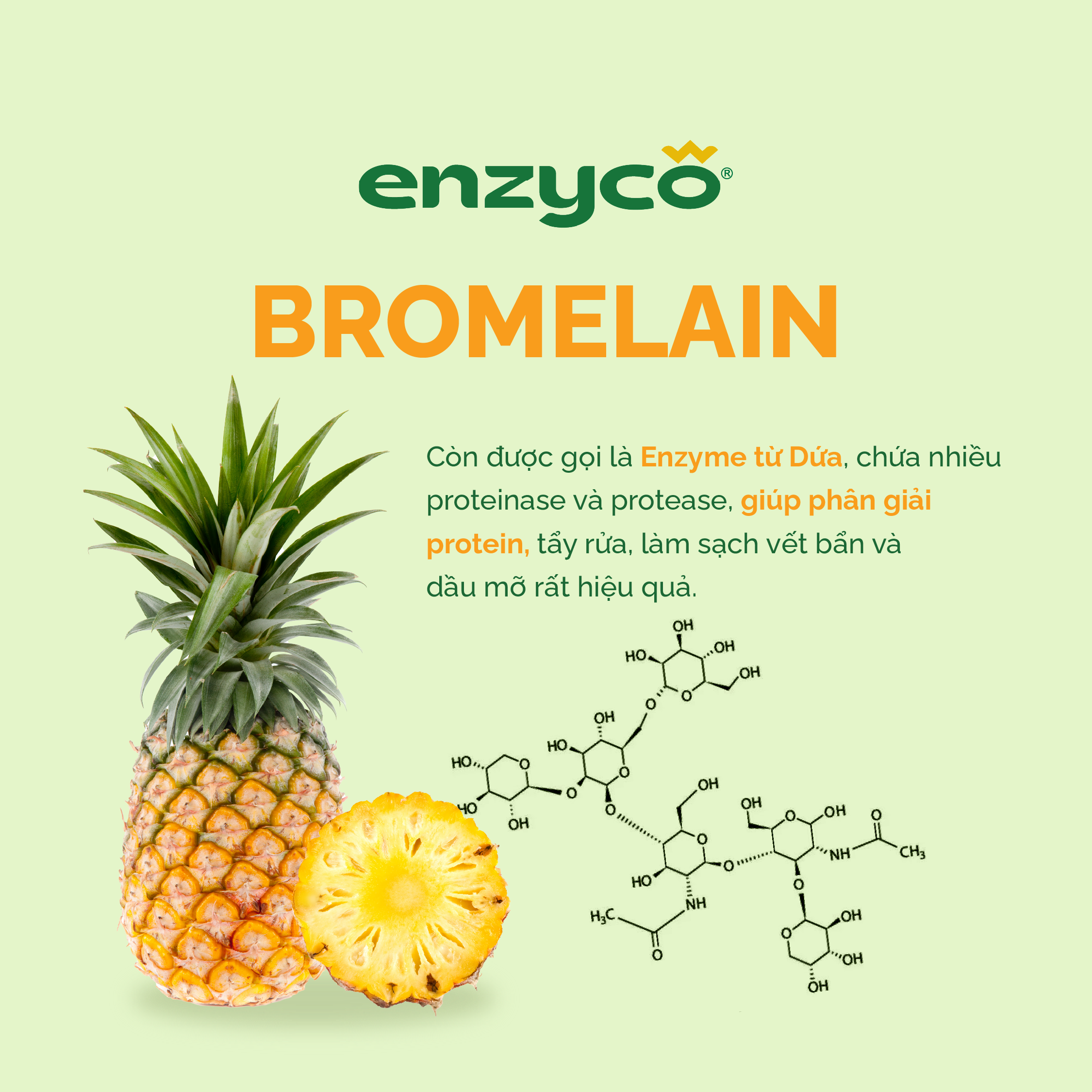 - Dứa ủ lên men theo phương pháp độc đáo của Enzyco sẽ tạo ra Enzyme Bromelain và dung dịch có tính axit hữu cơ khá mạnh giúp tẩy rửa, làm sạch vết bẩn và dầu mỡ rất hiệu quả. (Chúng tôi chỉ sử dụng vỏ dứa để tạo enzyme, giúp hạn chế rác thải nông nghiệp.)