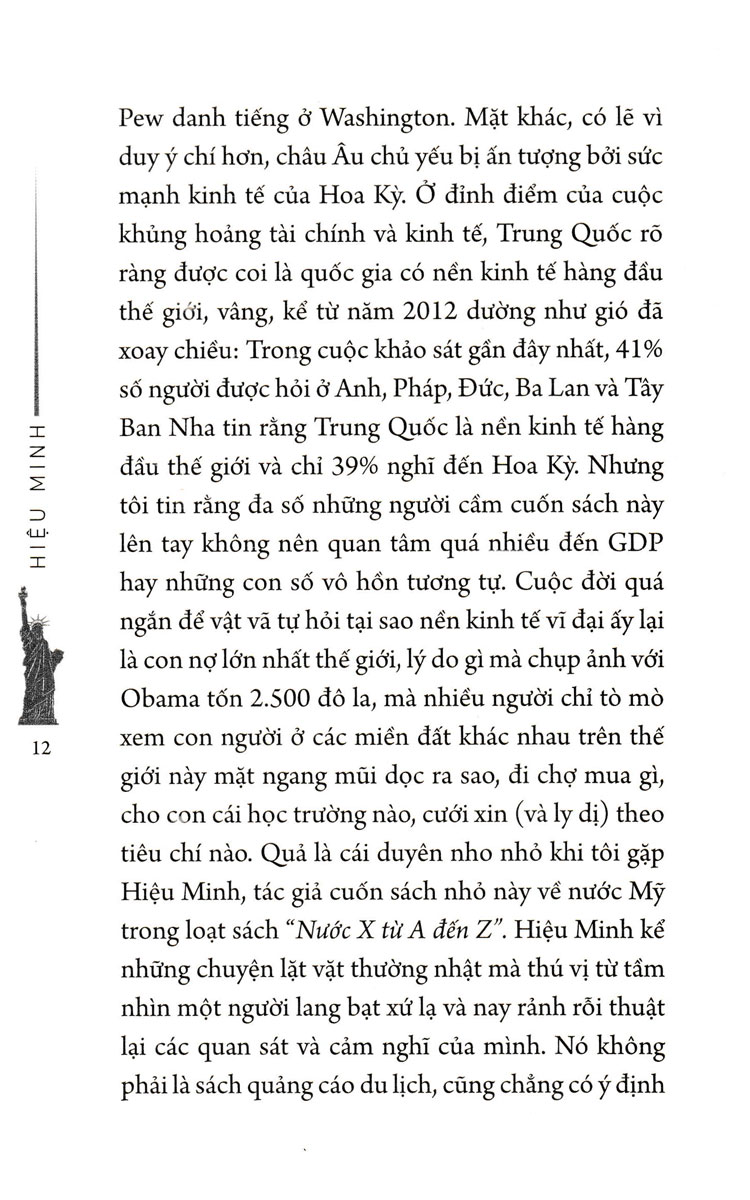 Nước Mỹ trong quan sát của tác giả Hiệu Minh không chỉ là những điều to lớn, vĩ đại khiến nhân loại phải công nhận như là quốc gia đầu tiên có người đặt chân lên Mặt trăng, quốc gia của những giải Nobel hay đất nước công nghệ số 1 mà đó còn là đất nước với “A-American Dream tưởng là giấc mơ Mỹ nhưng chỉ là giấc mơ trong mắt trẻ trâu với những trải nghiệm thật. Tương tự, tác giả nhìn ra Hoa Kỳ là cái Z-Zoo vì môi sinh được giữ gìn. S-Special Education nói về người cha đưa hai con nhỏ tới Mỹ, một con mắc chút tự kỷ, được nền giáo dục Mỹ yêu thương và hôm nay đưa con tới bến đậu của American Dream…”. Những chuyện yêu đương, hôn nhân, việc học, việc làm, việc kiếm tiền để sống ở quốc gia dân chủ thì rất dân chủ nhưng cũng vô cùng khắc nghiệt để tồn tại với những khoản nợ, những vụn vặt thuế khóa, rồi chuyện đến Tổng thống cũng phải bán nhà để chữa bệnh cho con… có thể sẽ khá bất ngờ với nhiều người.