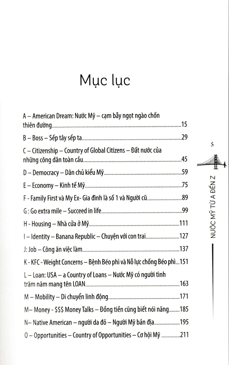 Với kết cấu các mục từ từ A đến Z, mỗi mục từ là một vấn đề câu chuyện mà tác giả giúp bạn đọc hiểu thêm về đất nước cờ hoa, hiểu về giấc mơ Mỹ vừa xa mà vừa gần, có thể chạm thấy nếu nỗ lực và chuyển mình trong một thế giới phẳng, góp thêm một màu sắc riêng của mỗi quốc gia dân tộc vào những mảnh ghép của Hợp chủng quốc Hoa Kỳ. Cuối mỗi mục từ có thêm một vài câu trích tiếng Anh liên quan đến mục từ, bạn đọc có thể đọc vui vui trước khi chuyển sang một mục từ mới.