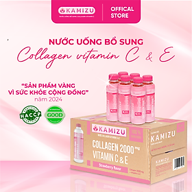 Nước uống bổ sung Kamizu Collagen Vitamin C & E - Thùng 24 chai Thành phần: Nước tinh khiết , Collagen fish , Vitamin C, hương liệu tổng hợp hương dâu , chất tạo ngọt