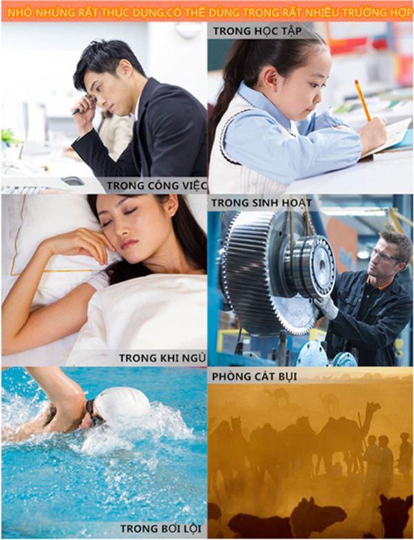 - Sản phẩm có tác dụng ngăn nước vào tai khi đi bơi, ngoài ra, nếu bạn đang đau đầu và mệt mỏi vì sống trong môi trường ô nhiễm tiếng ồn như gần công