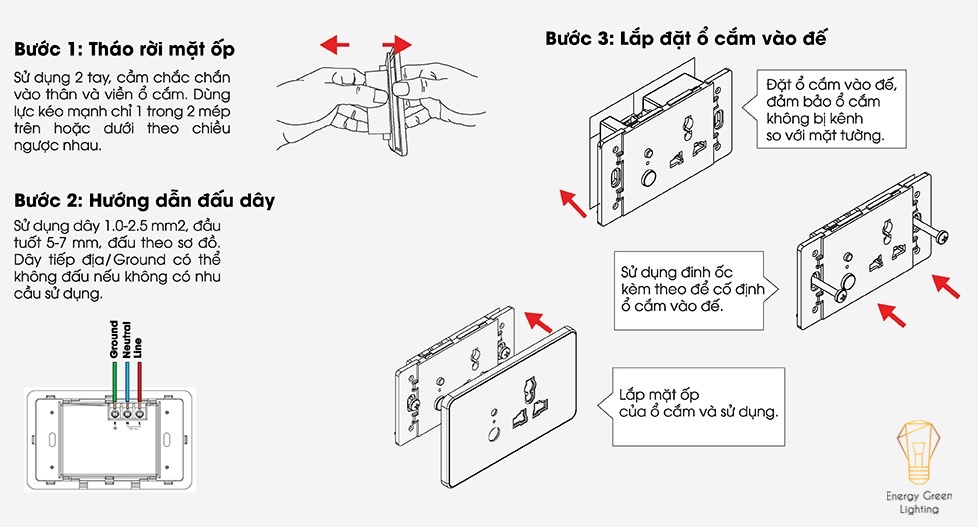 Dải điện áp hoạt động: (150-250)V/50Hz Dòng điện ổ cắm tối đa: 10A Công suất ổ cắm tối đa: 2500W Số chu kỳ bật tắt: 100.000 lần Dải nhiệt độ hoạt động: (-10-45)°C Kích thước