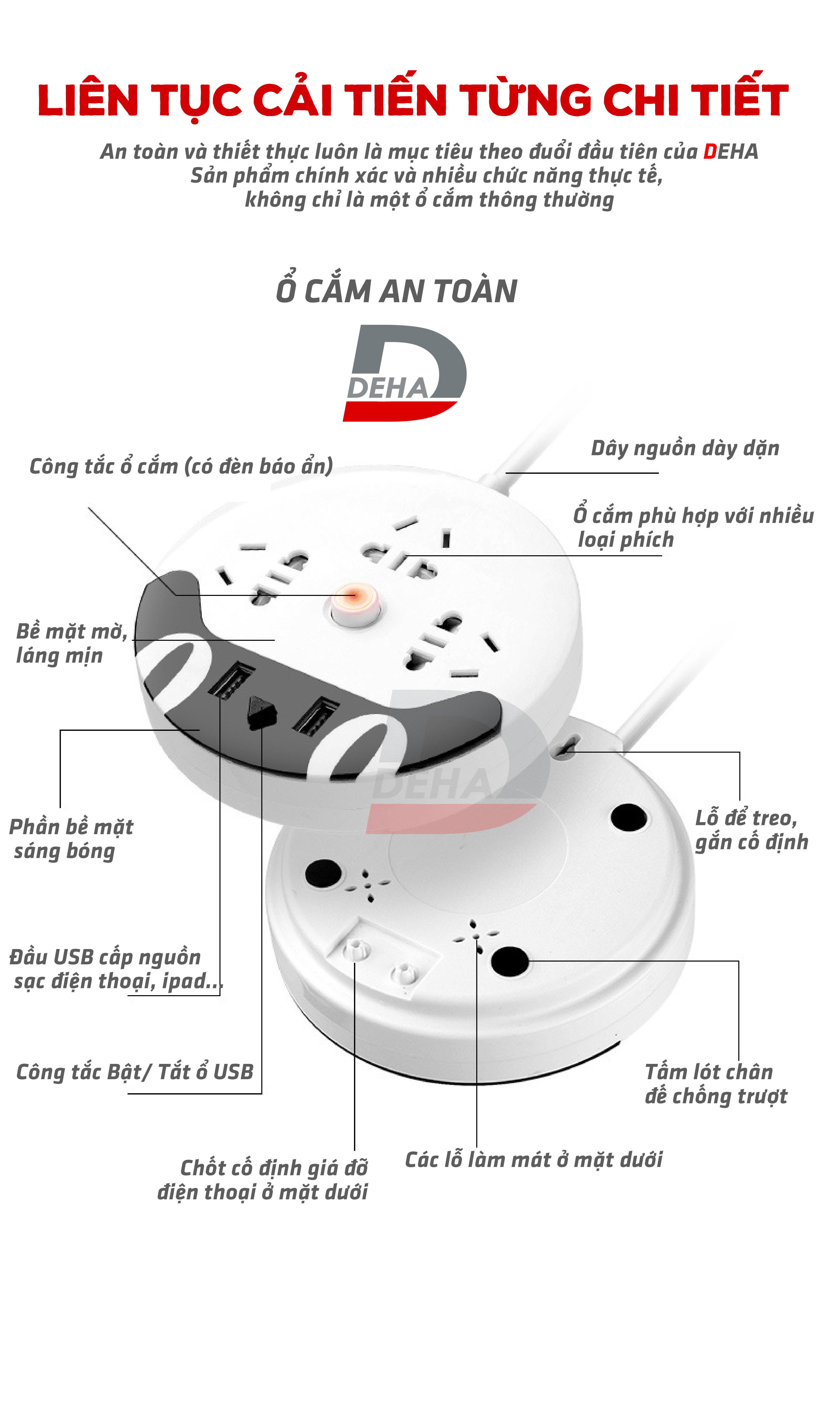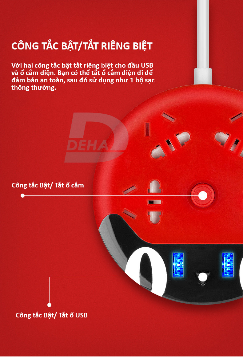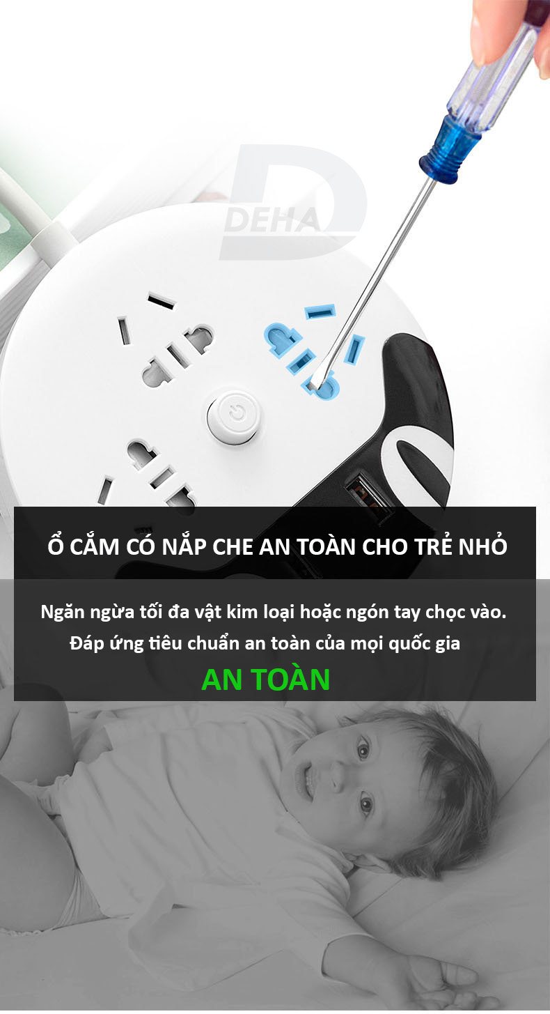 Ổ cắm 3 ổ đa năng + 2 ổ cắm USB cách điện bền đẹp - Chịu nhiệt, chống cháy: 750 độ C - Chiều dài dây điện: 1.8 mét - Chân tiếp xúc với