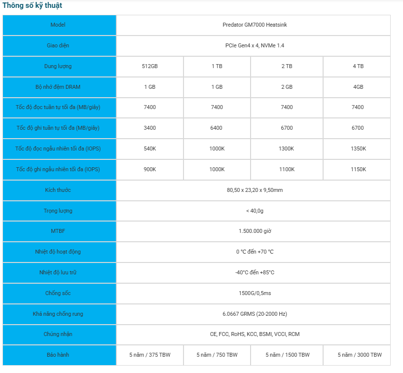 Ổ cứng Gaming SSD Acer Predator GM7000 Heatsink 512GB / 1TB / 2TB PCIe Gen 4x4, Tốc độ đọc Up to 7400 MB/s Bảo hành 5 năm