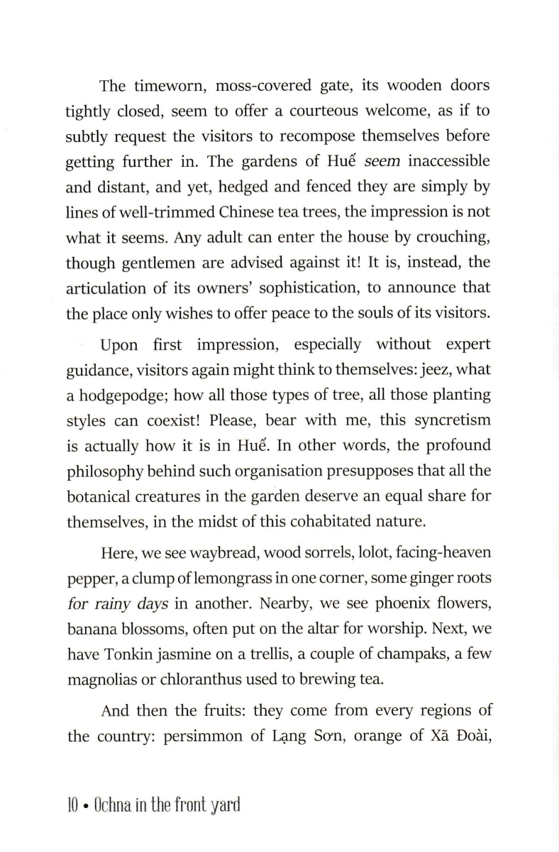 Ochna In The Front Yard - Fascinating Stories About Huế - An Ancient, Poetic And Glamorous Land GIỚI THIỆU SÁCH: Ochna In The Front Yard - Fascinating Stories About Huế - An Ancient, Poetic And Glamorous Land là tập ghi chép về “nước Huế” phong rêu kiêu sa của nhà báo Minh Tự. Hơn ba mươi bài viết của tác giả trong cuốn sách sách hầu hết được viết vào những năm 2000 - 2002, khi anh từ Đà Lạt trở về quê hương sau gần 10 năm tha phương; và trong lần tái bản này, tác giả có cập nhật, chỉnh sửa các bài viết cho hoàn thiện thêm, cùng hình ảnh minh họa sinh động. Tập ghi chép đã khắc họa đậm nét văn hóa, lối sống của người Huế dưới các góc nhìn khác nhau, từ chuyện ăn theo lối Huế, chuyện cơm hến, mè xửng, tô bún bò đến đường kim mũi chỉ, vành nón bài thơ, gốc mai lão trượng hay phiên chợ khuya, mà với tác giả, đó là “lối Huế”. Chia sẻ về đứa con tinh thần của mình, tác giả Minh Tự nói: “Những tháng năm tôi được làm một người Huế sống ngoài Huế, và nhờ vậy mới hiểu rõ hơn, một cách khách quan hơn, về bản sắc riêng biệt của xứ sở nà Cuốn sách này xin cùng khám phá nghệ thuật sống của người Huế, dù không thể nói hết muôn màu muôn vẻ của ‘lối Huế’. Nó chỉ là những trạng thái của Huế được chúng tôi ‘đọc’ được và thuật lại bằng cách của một người viết báo.”