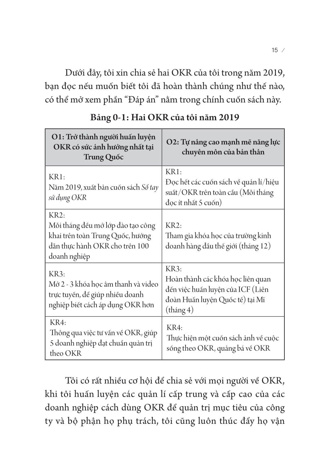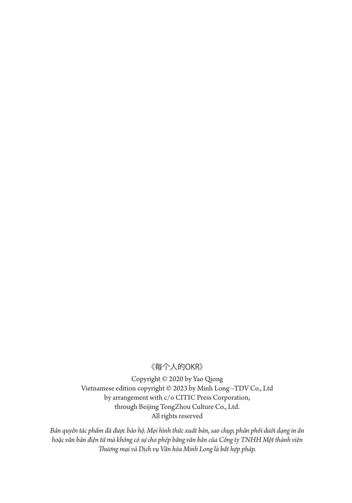 Hi vọng răng mọi người có thể dùng OKR để quản trị công việc và cuộc sống của bản thân. Tôi tin chắc bạn đọc có thể có được thu hoạch hữu ích sau khi đọc xong cuốn sách này, bởi vì OKR chính là phương pháp quản trị cuộc đời tuyệt diệu nhất.
