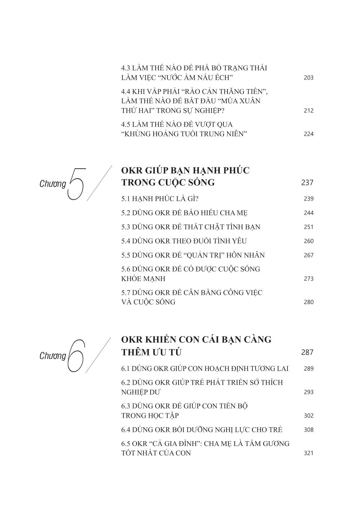 Bắt đầu từ chương 3, cuốn sách sẽ tập trung vào việc ứng dụng OKR vào công việc, học tập và cuộc sống của mỗi cá nhân. Khi đọc xong, bạn chắc chắn sẽ bừng bừng khí thế mà đặt ra các loại mục tiêu khác nhau cho bản thân.