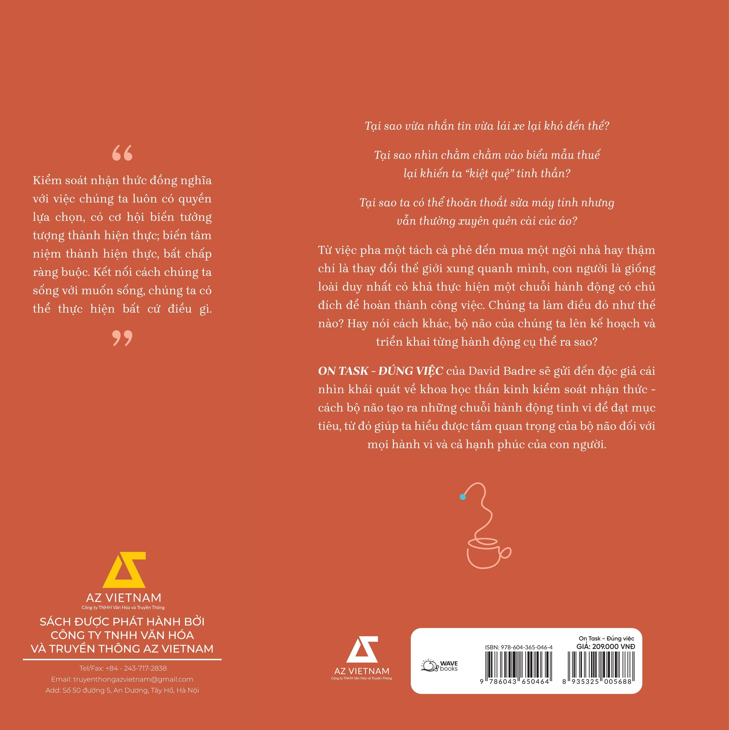 ON TASK - ĐÚNG VIỆC của Tiến sĩ David Badre sẽ gửi đến độc giả cái nhìn khái quát về khoa học thần kinh kiểm soát nhận thức - cách bộ não tạo ra những chuỗi hành động tinh vi để đạt mục tiêu, từ đó giúp ta hiểu được tầm quan trọng của bộ não đối với mọi hành vi và cả hạnh phúc của con người.