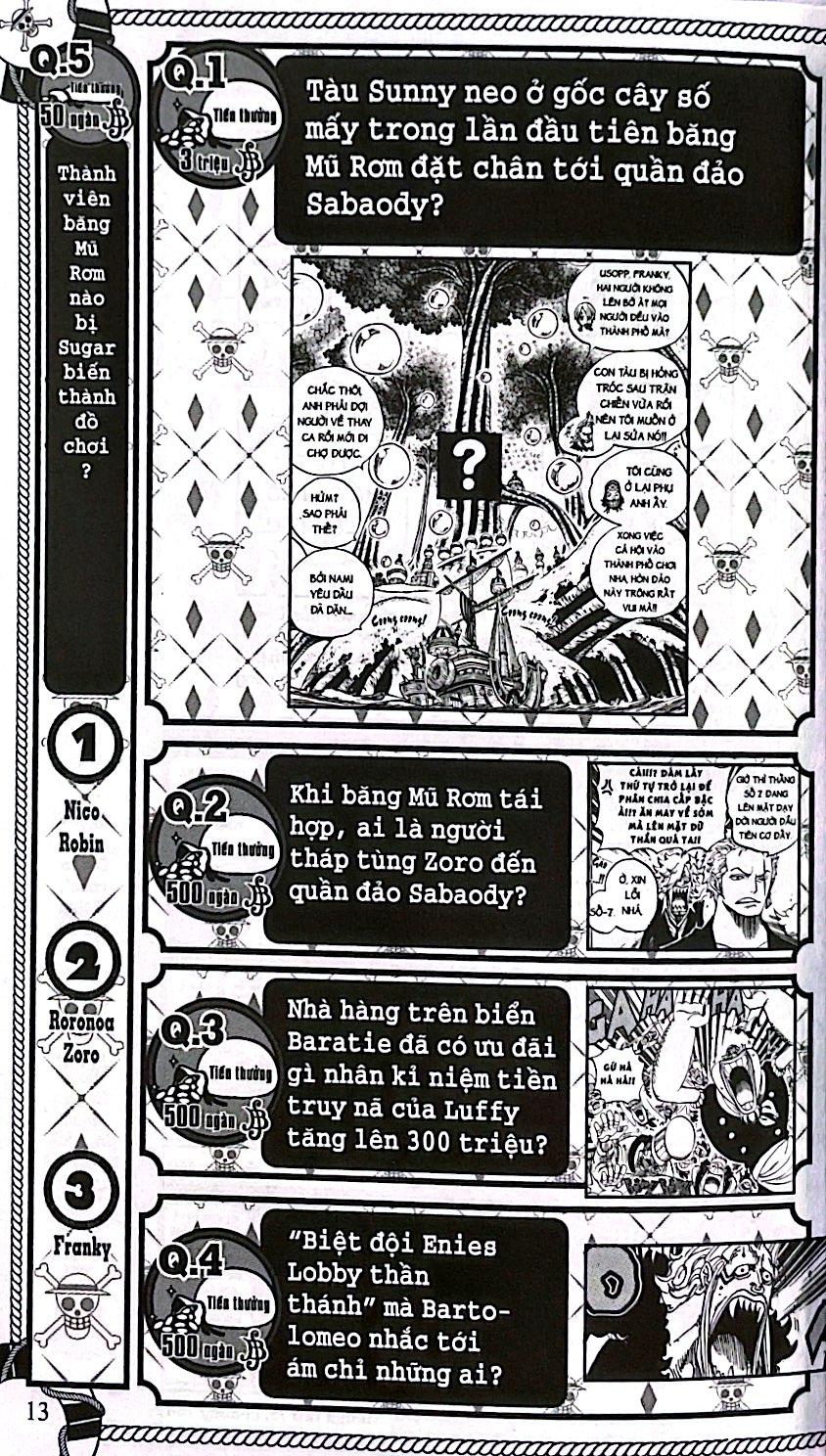 Các câu đố vui trong cuốn sách được phân chia thành những chủ đề khác nhau như: Chủ đề về các thành viên băng Hải tặc Mũ Rơm, Thất Vũ hải, Hải quân hay Tứ hoà Toàn bộ những chuyến phiêu lưu, trận chiến đình đám trong tác phẩm sẽ trở thành những thử thách đủ sức làm khó những Fan kì cựu nhất!!