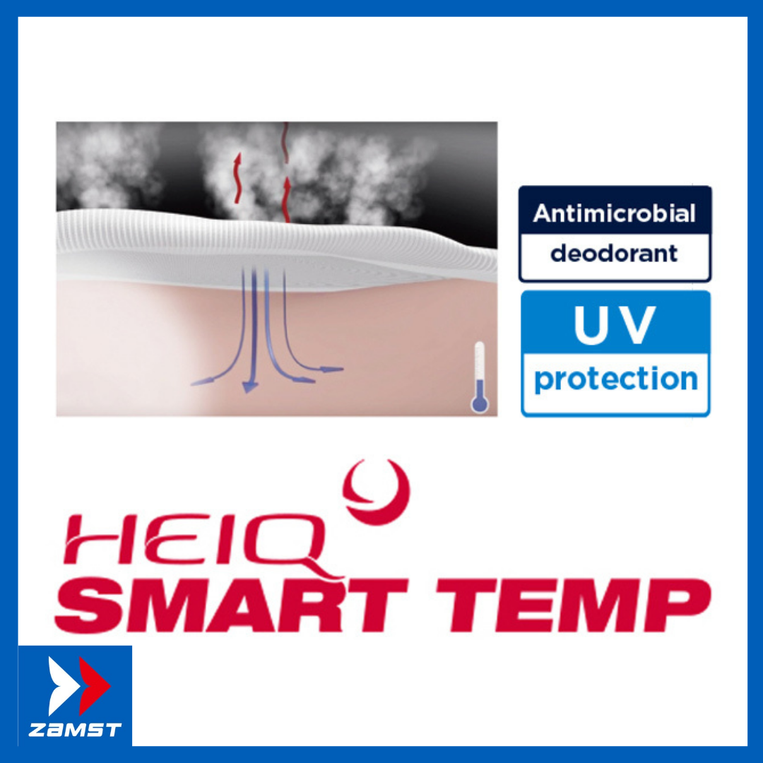 - Temperature control function by “HeiQ SMART TEMP” In response to the skin temperature, fabrics adjust the amount of sweat to dry and control body temperature. In a hot weather, it effectively evaporates sweat to lower body temperature, and in a cold weather, the material maintains sweat so that a drop in the body temperature due to heat of vaporization is suppressed.