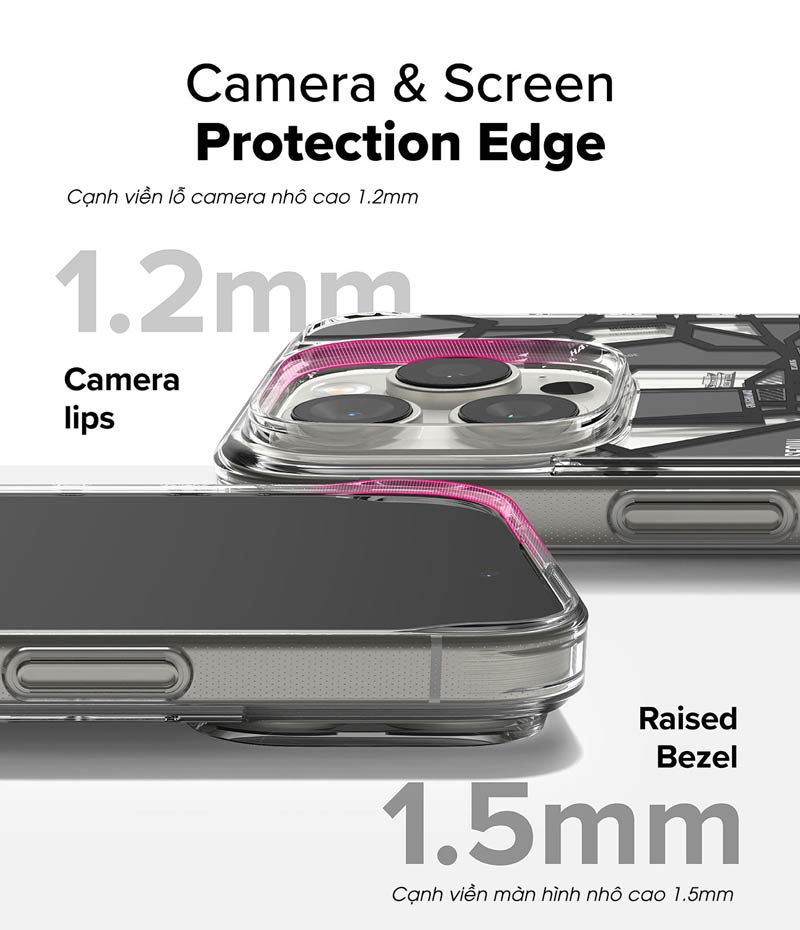 - Thiết kế cạnh viền màn hình nhô cao 1.5 mm và cạnh viền camera nhô cao 1.2 mm giúp chống trầy
