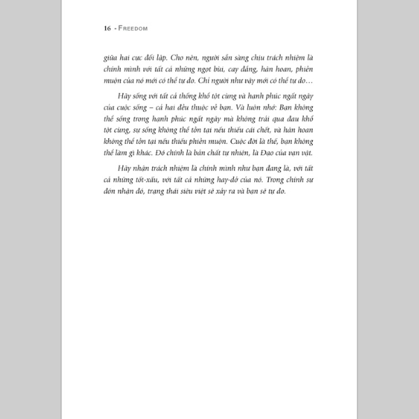 Với những chia sẻ đầy khai mở, cuốn sách “Tự do – Như chim tung cánh” giúp người đọc xác định những trở ngại đối với tự do của họ, có thể do hoàn cảnh hoặc do bản thân họ tự áp đặt, tìm thấy lòng dũng cảm để thành thật với chính mình. Và hãy lắng nghe lời Osho nhắn nhủ chúng ta: “Hãy sống với tất cả thống khổ tột cùng và hạnh phúc ngất ngây của cuộc sống – cả hai đều thuộc về bạn. Và luôn nhớ: Bạn không thể sống trong hạnh phúc ngất ngây mà không trải qua đau khổ tột cùng, sự sống không thể tồn tại nếu thiếu cái chết, và hân hoan không thể tồn tại nếu thiếu phiền muộn. Cuộc đời là thế, bạn không thể làm gì khác”.
