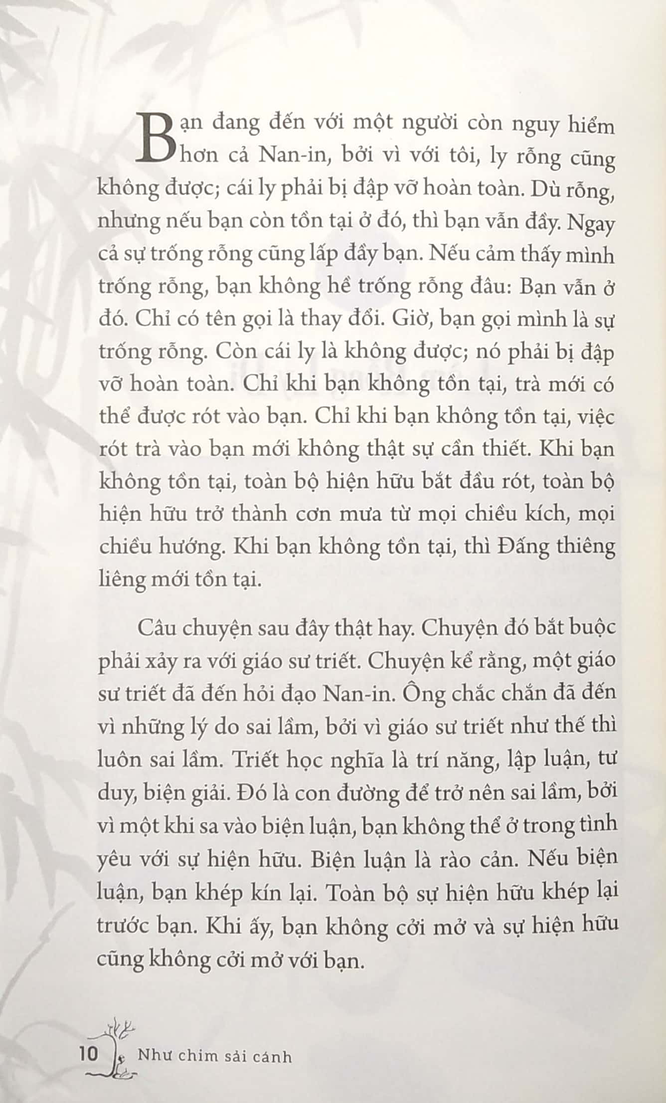 Qua mười một giai thoại kinh điển, từ vị giáo sư trong đầu chứa đầy ý tưởng đến mức không còn có thể học thêm gì khác, cho đến vị tăng đầu bếp giải công án bằng cách đá bình nước, độc giả sẽ nhìn thấy chính mình, bạn bè, và thậm chí cả những người nổi tiếng và các chính trị gia phản ánh trong những nhân vật chính của các câu chuyện Thiền thi vị ấy. Ở mỗi chương, theo sau phần thảo luận về giai thoại chính trong chương, Osho cũng trả lời các câu hỏi của khán giả về tình yêu, cuộc sống, các mối quan hệ và công cuộc “truy cầu”. Xuyên suốt NHƯ CHIM SẢI CÁNH, ông nhấn mạnh tầm quan trọng của việc vừa tôn vinh “gốc rễ” trong những niềm vui giản đơn của cuộc sống thường ngày, vừa nuôi dưỡng “đôi cánh” cho ta trải nghiệm sự gắn kết với cái phổ quát, siêu việt và vĩnh hằng.