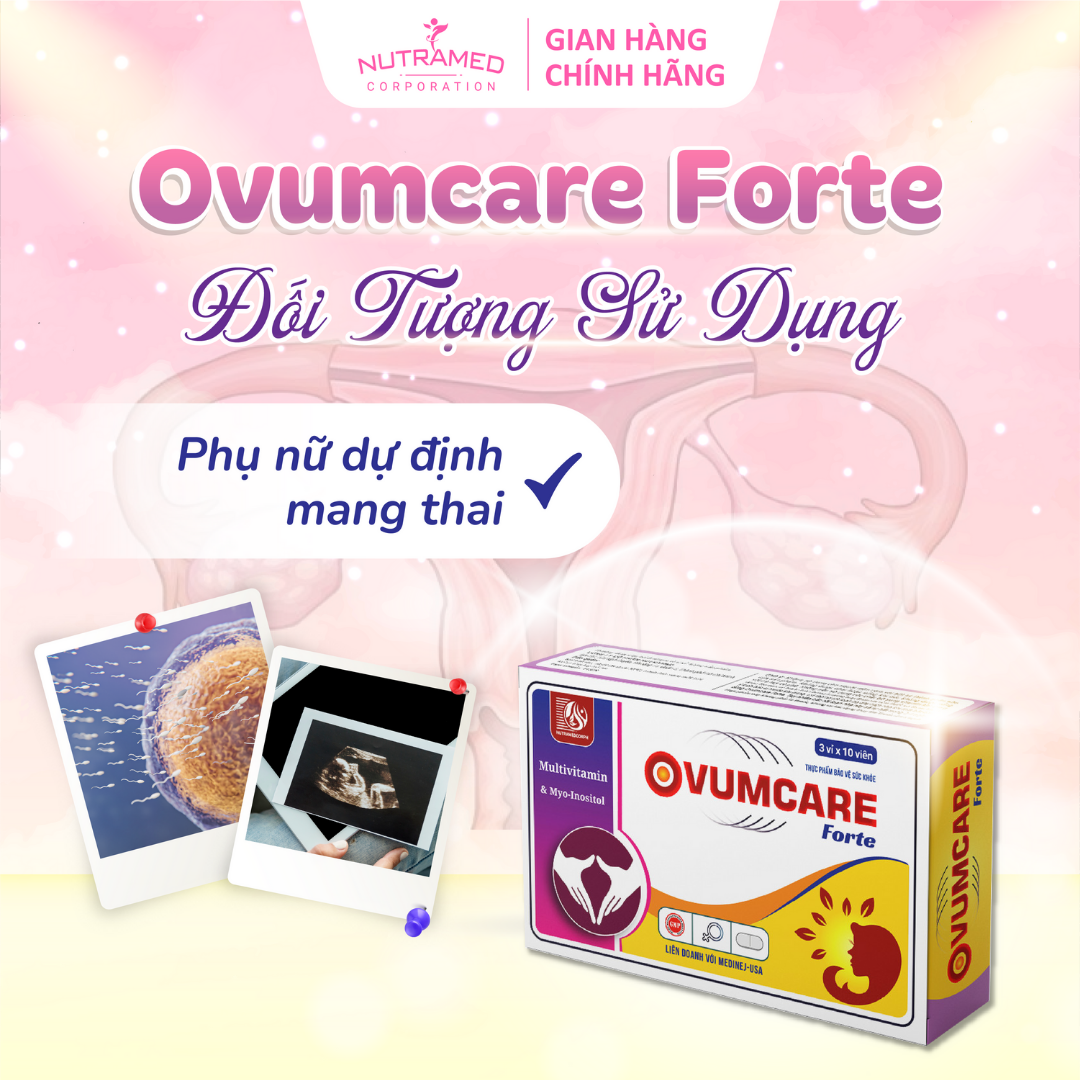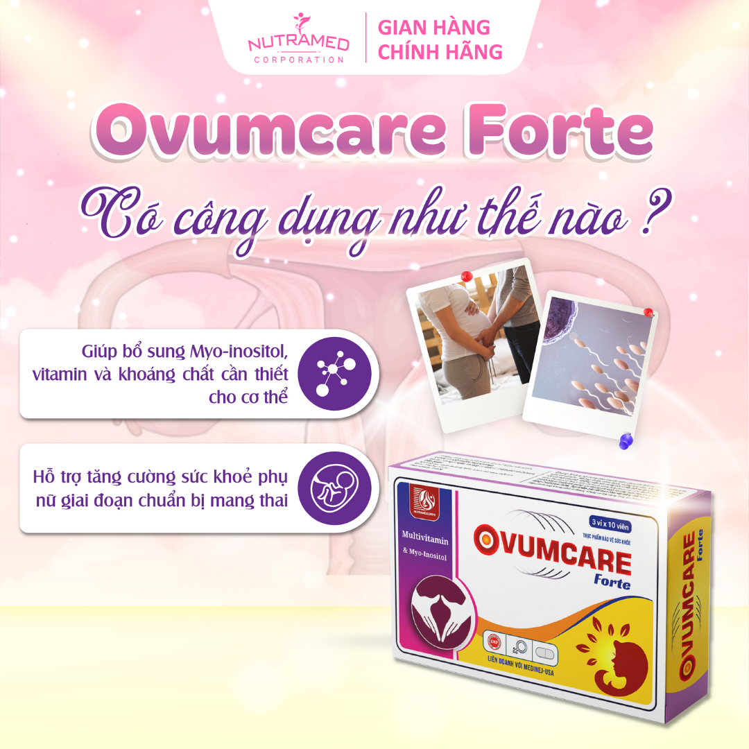 THÀNH PHẦN ️️ Myo-inositol; Acid Folic; Vitex agnus castus extract; Sắt; N-Acetyl-cystein; Selen; Vitamin C; Crom; Vitamin E; l-ốt; Magie; Vitamin B12; Nicotinamide; Vitamin B2; L-Arginine HCL; Vitamin A; Acid para-aminobenzoic; Mangan; Kẽm; Vitamin D3; Vitamin B1; Đồng; Vitamin B6 CÔNG DỤNG   ️️ Giúp bổ sung Myo-inositol, vitamin và khoáng chất cần thiết cho cơ thể hỗ trợ tăng cường sức khỏe phụ nữ giai đoạn chuẩn bị mang thai. ĐỐI TƯỢNG SỬ DỤNG ️️ Phụ nữ dự định có thai. HƯỚNG DẪN SỬ DỤNG ️️ Uống 2 viên/ngày, sáng uống 1 viên, chiều uống 1 viên, uống sau khi ăn. KHÔNG SỬ DỤNG TRONG TRƯỜNG HỢP ️️️ Người mẫn cảm với bất kỳ thành phần nào của sản phẩm. LƯU Ý ️️️ Không được nhai hoặc uống khi đói, không được uống với trà hay cà phê. Không nên sử dụng các chất bổ sung vitamin khi đang dùng Ovumcare Forte trừ những trường hợp thực sự cần thiết và tham khảo ý kiến bác sĩ trước khi dùng. Có thể có rối loạn dạ dày ruột nhẹ khi mới bắt đầu dùng Ovumcare Forte. Tuy nhiên các rối loạn nhẹ này sẽ tự hết trong 3-4 ngày.  ️️️ Thực phẩm này không phải là thuốc, không có tác dụng thay thế thuốc chữa bệnh. BẢO QUẢN  ️️️ Nơi khô ráo, nhiệt độ dưới 30°C, tránh ánh sáng mặt trời. Để xa tầm tay trẻ em. THÔNG TIN SẢN PHẨM Sản phẩm: Ovumcare Forte Quy cách đóng gói: Hộp 3 vỉ x 10 viên. Hạn sử dụng: 36 tháng kể từ ngày sản xuất. Tiêu chuẩn: TCCS Nutramed - Khơi Nguồn Khoa Học Tới Cuộc Sống Nhà máy đạt chuẩn WHO – GMP, nguyên liệu kiểm tra chất lượng nghiêm ngặt, đảm bảo an toàn và hiệu quả.