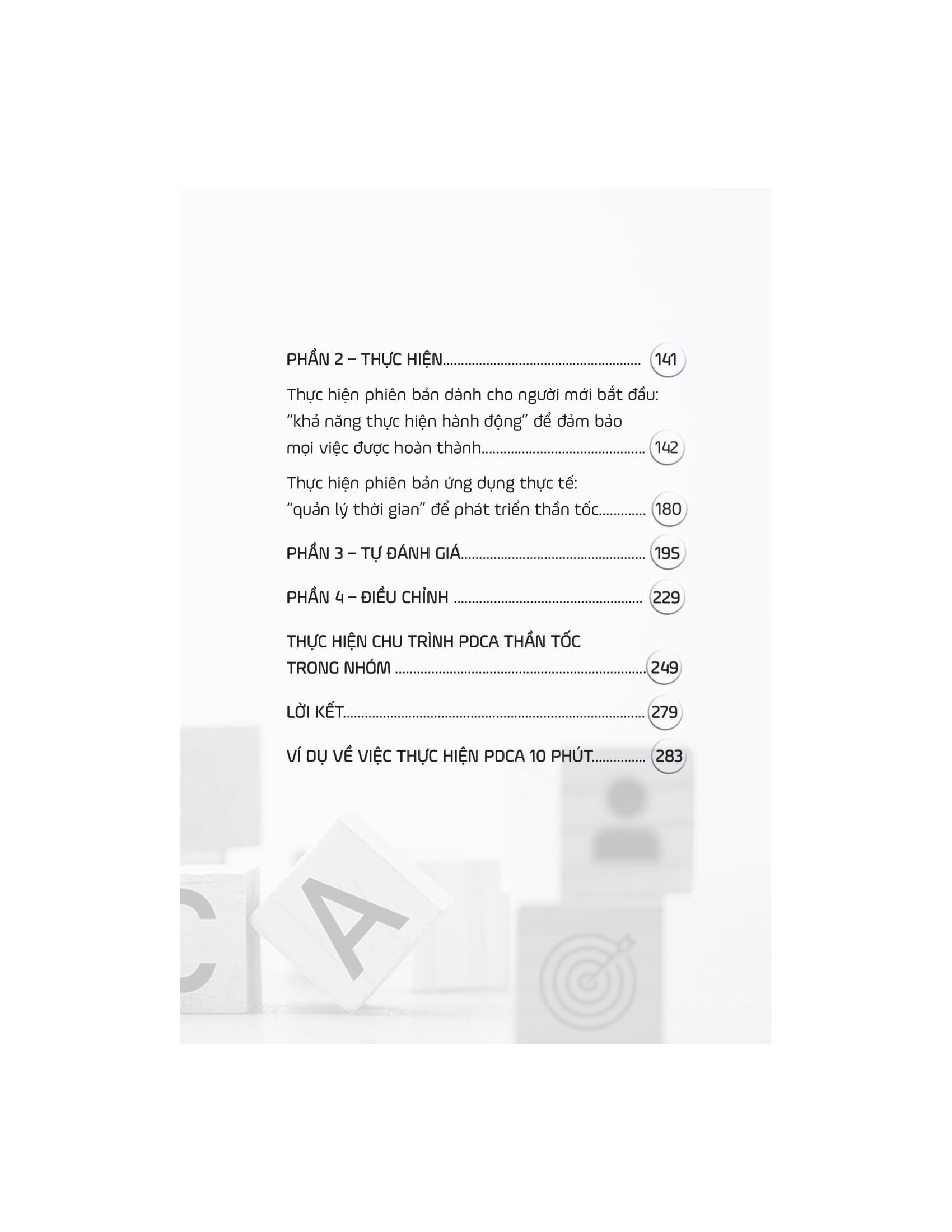“PDCA – Công cụ lập kế hoạch hiệu quả” một cuốn sách chứa đựng những bí mật về “tốc độ thần tốc” của PDCA mà không phải ai cũng biết để áp dụng. Nó phù hợp cho rất nhiều đối tượng và được khuyên sử dụng cho cả gia đình cùng tìm hiểu và thực hành. Hãy khám phá ngay “chu trình PDCA thần tốc” để sở hữu sức mạnh tổ chức hiệu quả giúp đưa doanh nghiệp và đời sống cá nhân của bạn phát triển vượt bậc một cách nhanh chóng.
