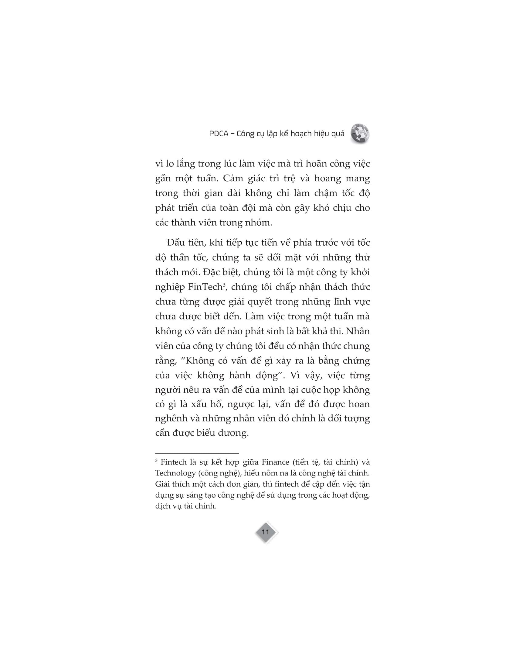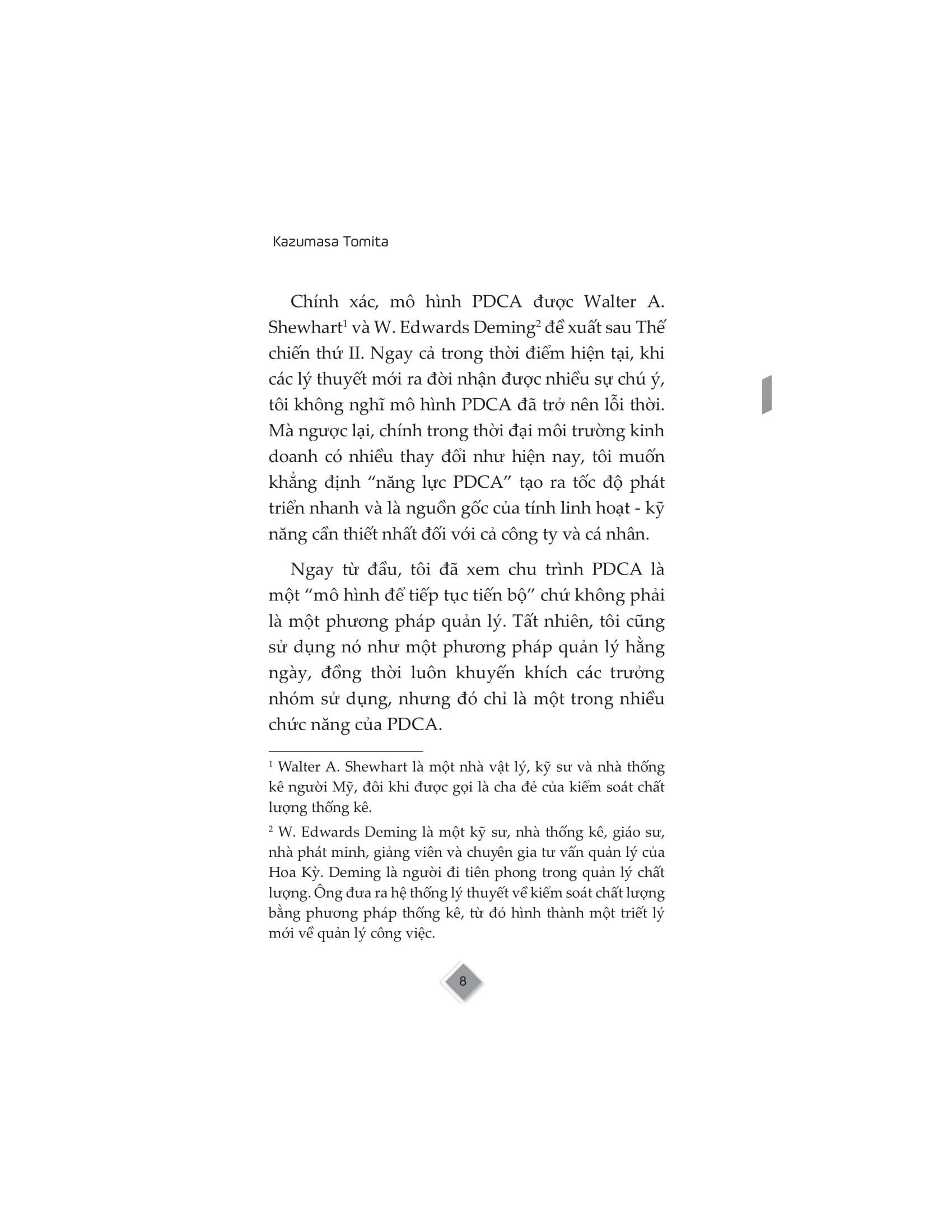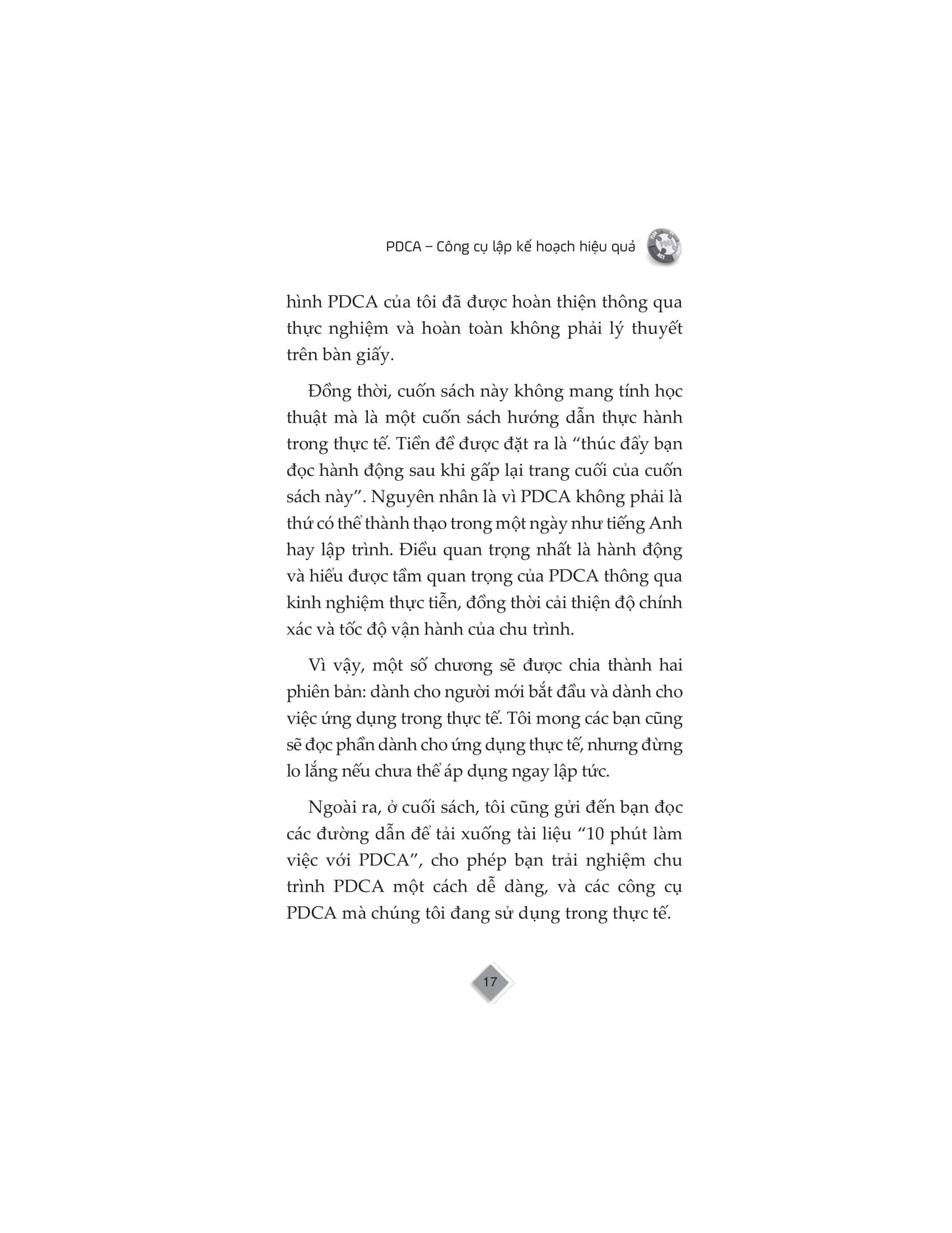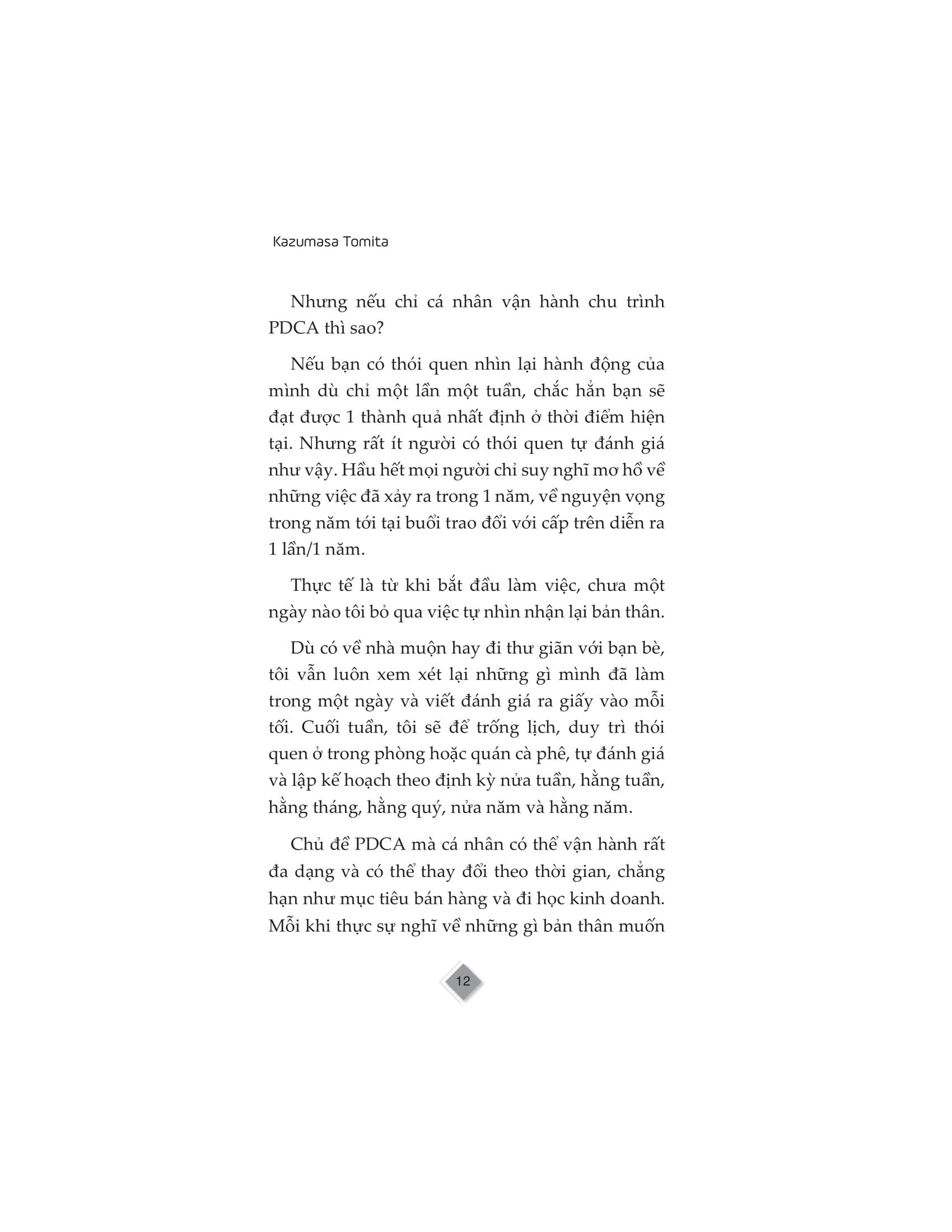 Chu trình PDCA bao gồm bốn bước PLAN (kế hoạch), DO (thực hiện), CHECK (tự đánh giá) và ADJUST (điều chỉnh), là một khuôn khổ cổ điển mà mọi doanh nhân đều biết, tuy nhiên, lại không nhiều người hiểu được hết để áp dụng trong doanh nghiệp của mình. Nhưng một khi nắm vững chu trình PDCA và thực hiện nó, bạn có thể đưa doanh nghiệp của mình phát triển với tốc độ chóng mặt; bạn sẽ không còn do dự hay lo lắng về những quyết định của mình; bạn sẽ luôn giữ được động lực để thực hiện mục tiêu đã đề ra ban đầu và doanh nghiệp hay thậm chí chính cuộc sống cá nhân của bạn sẽ đạt được kết quả tối ưu nhất.