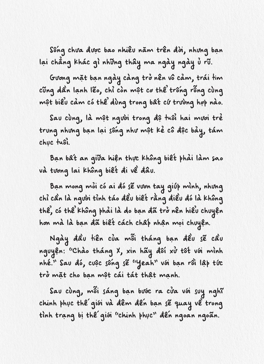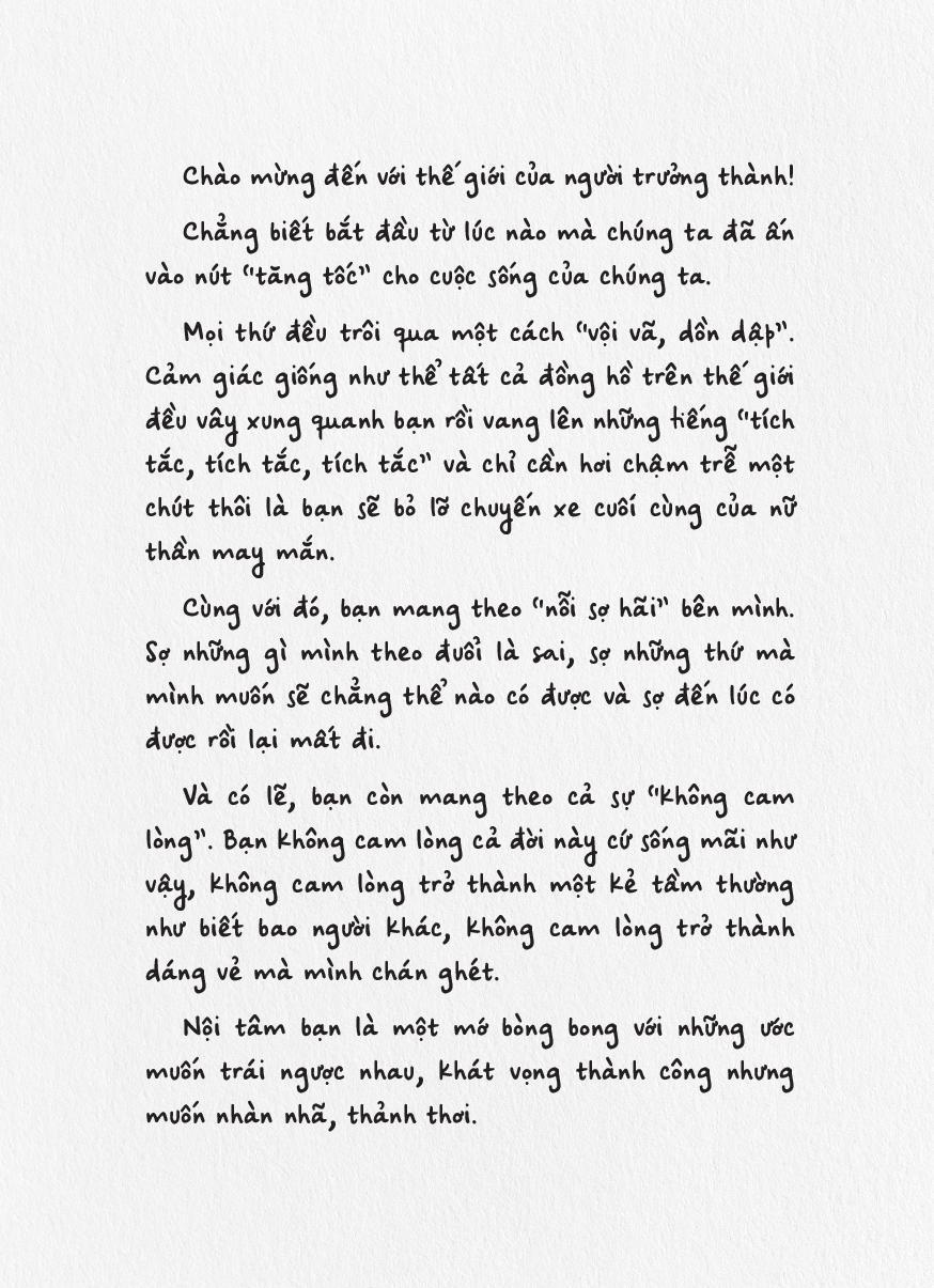 Hy vọng cuốn sách nhỏ này sẽ trở thành người đồng hành cùng bạn trong hành trình trưởng thành đầy rẫy những gian nan - nhưng cũng biết bao điều kỳ thú. Mỗi khi thấy nản chí hay mỏi mệt, hãy mở một trang sách bất kỳ, nhâm nhi từng dòng để cảm thấy trái tim của bạn được ôm ấp, vỗ về.