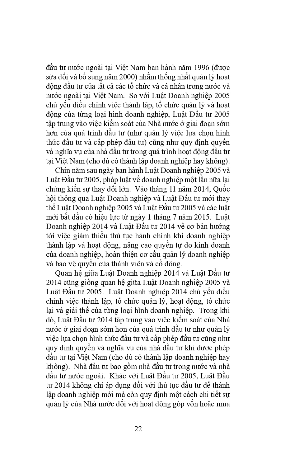 Cuốn sách đầu tiên nghiên cứu một cách có hệ thống các vấn đề pháp luật về doanh nghiệp của Việt Nam từ cả góc độ lý thuyết và thực tiễn, tập trung vào các giao dịch mua bán doanh nghiệp và tài chính-ngân hàng có yếu tố nước ngoài dựa trên kinh nghiệm hành nghề thực tế của luật sư Trương Nhật Quang. Công ty luật YKVN nơi tác giả làm việc là một trong các công ty luật hàng đầu Việt Nam và tham gia tư vấn trong nhiều giao dịch giao dịch mua bán doanh nghiệp và tài chính-ngân hàng có yếu tố nước ngoài quan trọng nhất trên thị trường.