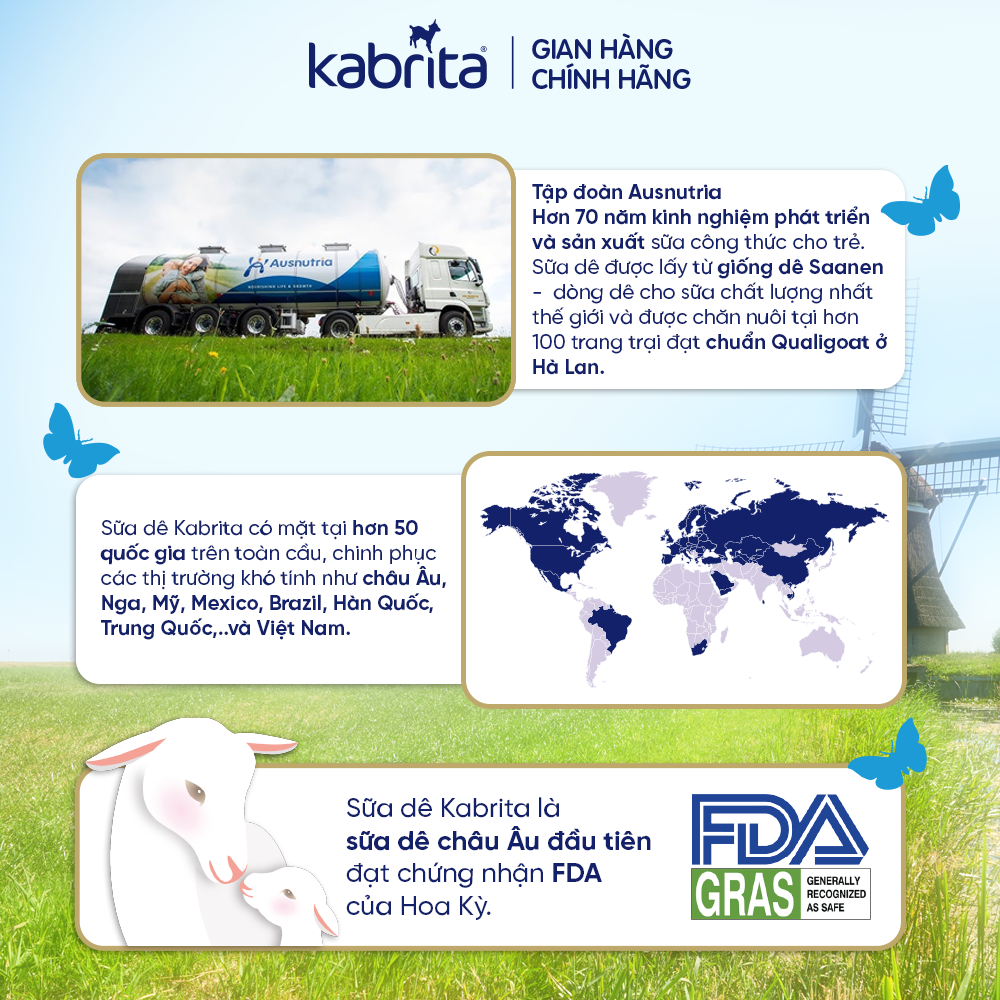 - Bổ sung 22 vitamin & khoáng chất cần thiết cho sự phát triển của trẻ Sữa dê Kabrita - Nhãn sữa dê số 1 thế giới - Nhập khẩu chính hãng từ Hà Lan. Sữa dê Kabrita là một thương hiệu thuộc tập đoàn Ausnutria - chuyên sản xuất & tiếp thị các sản phẩm sữa công thức với lịch sử hơn 100 năm. Sữa dê Kabrita hiện có mặt chính thức ở 44 quốc gia trên thế giới, bao gồm Việt Nam, được nhập khẩu chính hãng với giấy tờ đầy đủ & được Bộ Công thương cấp phép. Sữa dê Kabrita được sản xuất 100% từ các trang trại dê hiện đại, đạt chuẩn châu Âu tại Hà Lan - trang trại sữa của thế giới. Sữa dê Kabrita có vị thơm ngon, béo, dịu nhẹ, thanh mát, dễ uống. Sữa dê Kabrita với những đặc tính dịu nhẹ có sẵn từ sữa dê, cùng những sáng tạo tân tiến độc quyền, tạo nên một sản phẩm dinh dưỡng dịu nhẹ tối ưu cho hệ tiêu hóa còn non nớt của bé. Hàng triệu ba mẹ trên thế giới đã tin dùng sữa dê Kabrita cho con mình. Còn bạn thì sao? Thử ngay sữa dê Kabrita cho con bạn nhé!