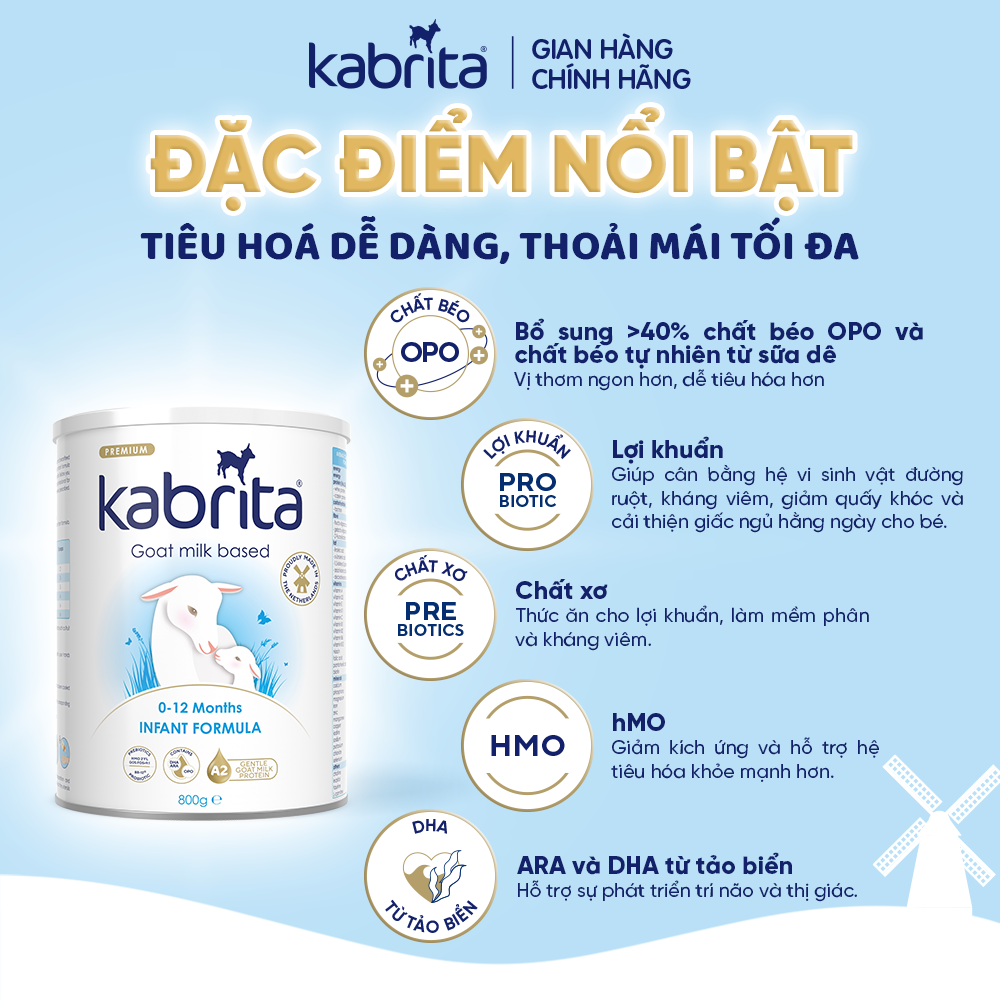 Sữa dê Kabrita - số 1 thơm ngon mát dịu cho bé với công thức & thành phần độc quyền theo tiêu chuẩn châu Âu, được sản xuất 100% từ nguồn sữa dê tươi tại các trang trại dê Hà Lan. Sữa dê Kabrita dịu nhẹ với hệ tiêu hóa non nớt của bé, cùng những cải tiến ưu việt trong công thức giúp hệ tiêu hoá khoẻ, giúp bé phát triển toàn diện và khỏe mạnh: