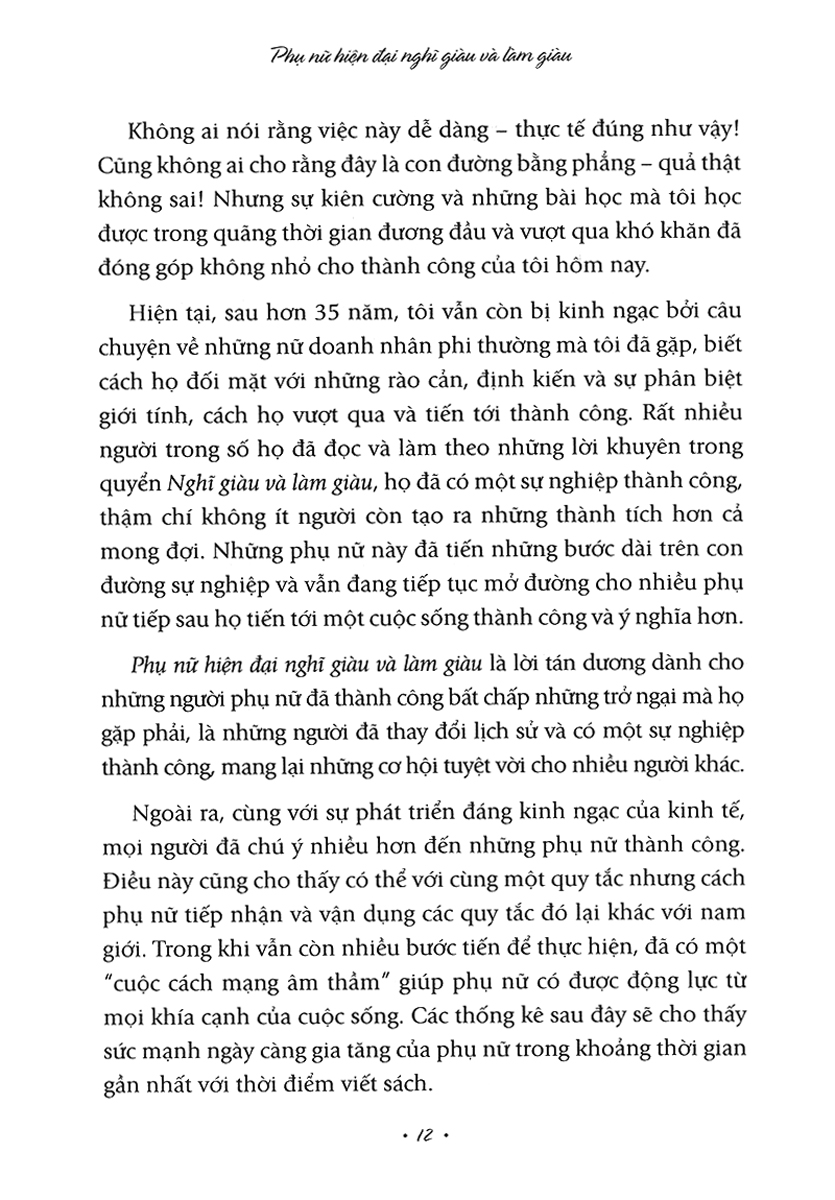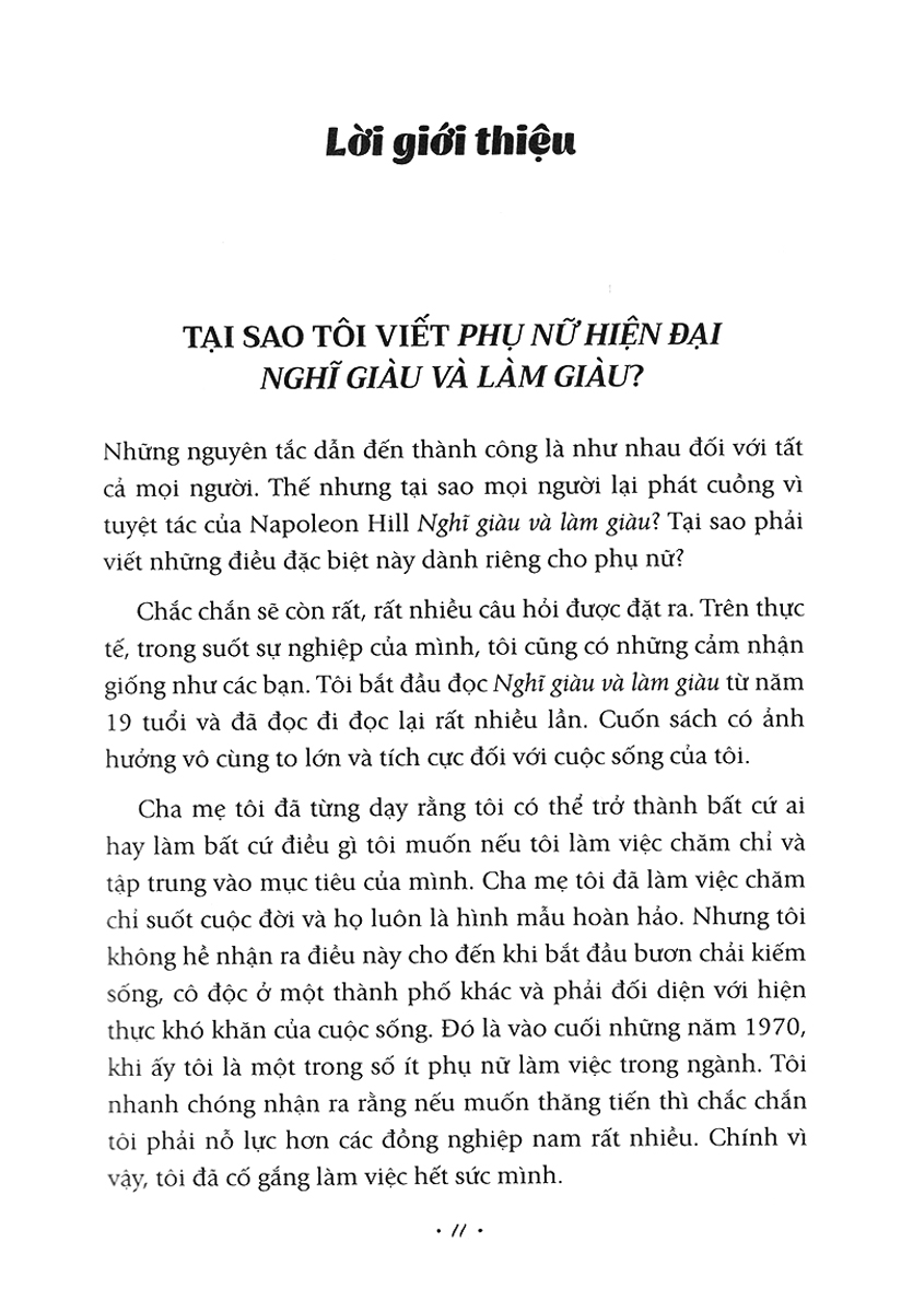 Tôi đã nghiên cứu về những người phụ nữ thành công trong quá khứ, đã phỏng vấn những người phụ nữ thành công ở hiện tại và nghiền ngẫm Nghĩ Giàu Và Làm Giàu của Napoleon Hill, từ đó đẻ ra 13 bước đề tiến tới thành công cho nữ giới dưới góc nhìn và kinh nghiệm của những người phụ nữ đã thành công này. Tôi đã từ chối viết sách cho phụ nữ trong suốt nhiều năm qua, nhưng giờ chính xác là thời điểm hoàn hảo dành cho Phụ Nữ Hiện Đại Nghĩ Giàu Và Làm Giàu." (Sharon Letcher).