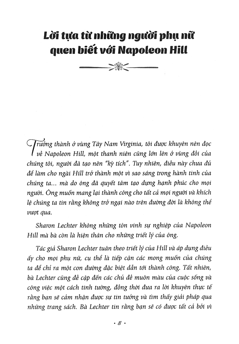 Sharon Lechter là một điển hình tiêu biểu của phụ nữ hiện đại, thành công, tạo dựng một cuộc đời giàu có không chỉ về tài chính mà còn về giá trị con người. Bà hiện là một chuyên gia quốc tế về tài chính được trọng vọng trong vai trò là thành viên hộ đồng Tư vấn Tài chính cho hai đời tổng thống Mỹ là G. W. Bush và Barack Obama. Bà đồng thời là một nhà từ thiện, nhà giáo dục, diễn giả quốc tế, và là tác giả của nhiều đầu sách bán chạy trên thế giới. Mang đến độc giả bước nối dài trong hành trình giúp đỡ doanh giới của Napoleon Hill, cuốn sách của Sharon tâp trung khai thác những hình mẫu thành công điển hình của doanh nhân nữ, trong môi trường kinh doanh quốc tế.