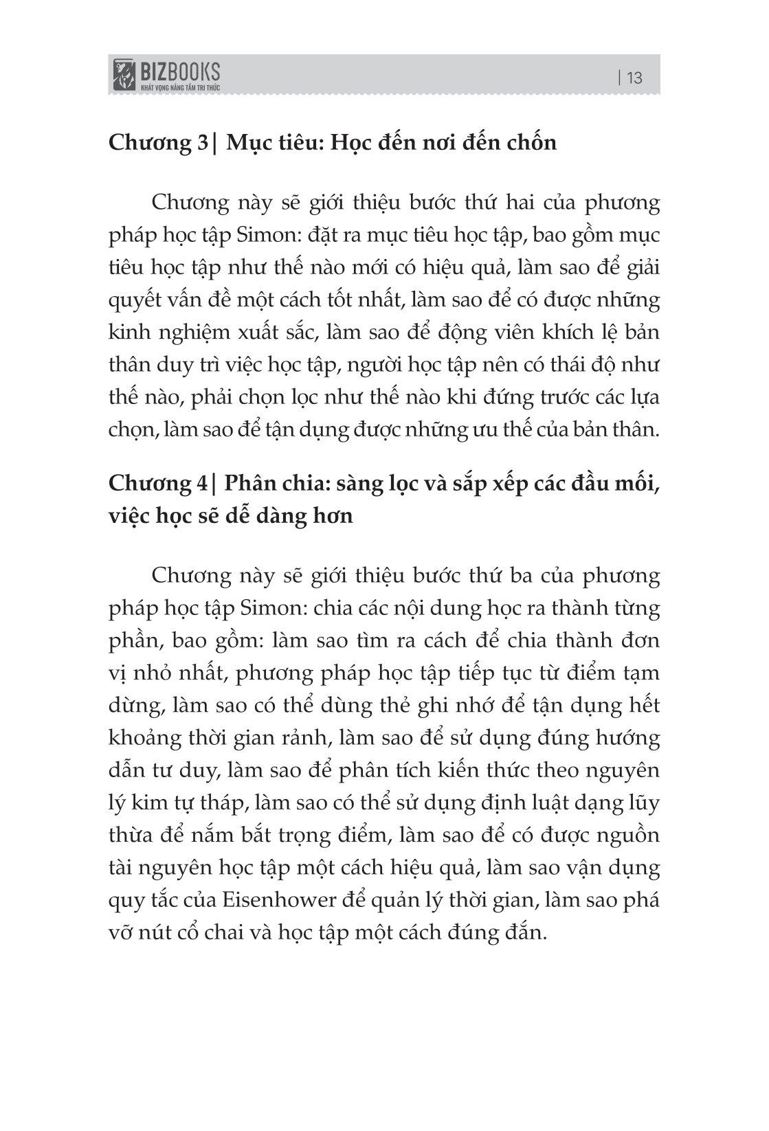 Trong cuốn “Phương pháp Simon - Cách học nhanh, nhớ lâu mọi kiến thức” đã chia sẻ những cách tiếp cận học tập đúng đắn, giúp người đọc có thể tập trung và hiểu được nội dung bài học một cách nhanh chóng hơn, từ cách xây dựng lộ trình học tập, quản lý thời gian cho đến cách nghiên cứu và đánh giá bài kiểm tra, tác giả đều cung cấp cho độc giả những gợi ý và phương pháp thực tiễn bám sát với thực tế chia nhỏ các kiến thức thành các “Chunking” (những điểm kiến thức) khác nhau để dễ dàng ghi nhớ