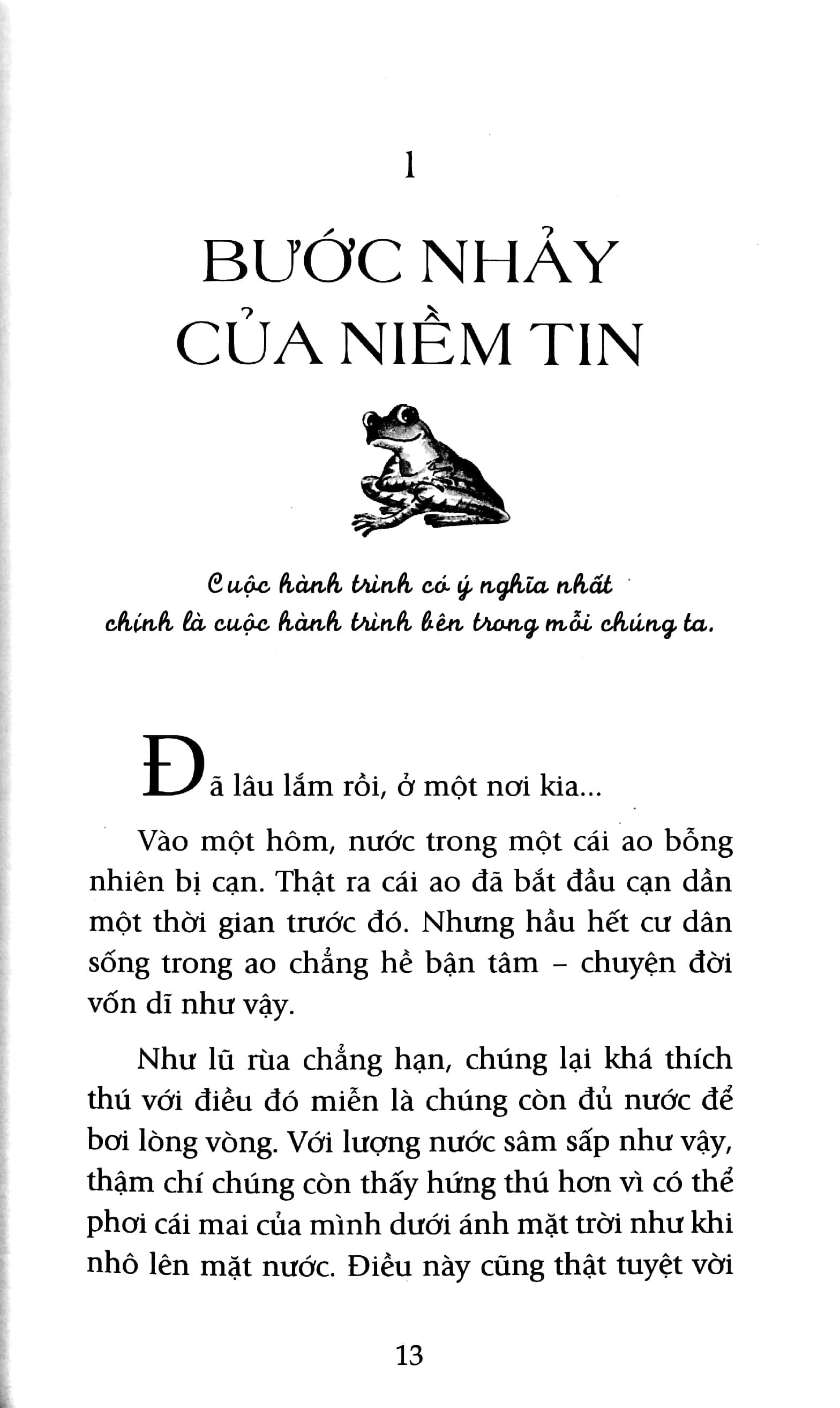 Và trong khi cùng nhau khám phá ý nghĩa huyền diệu của món quà tuyệt vời này, chúng ta đừng quên một điều rằng: “Trong lúc chúng ta bỏ thời gian chờ đợi hạnh phúc, thì hạnh phúc lại ở ngay bên cạnh ta”. Sách được biên dịch từ hai cuốn The Way of Ping- Journey to the Great Ocean – A Frog in Search of a New Pond của tác giả Stuart Avery Gold (Hoa Kỳ).