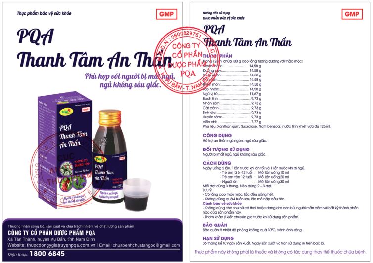 THÔNG TIN PQA THANH TÂM AN THẦN PQA Thanh Tâm An Thần là dược phẩm hỗ trợ giúp an thần ngủ ngon, ngủ sâu giấc cho người bị mất ngủ, thiếu ngủ, không ngủ sâu giấc. Thành phần: Trong 125ml chứa 100g cao lỏng tương đương với thảo mộc. Mạch môn: 14,58g Đương quy: 14,58g Bá tử nhân: 14,58g Đan sâm: 14,58g Thiên môn: 14,58g Táo nhân: 14,58g Ngũ vị tử: 11,67g Bạch linh: 9,73g Nhân sâm: 9,73g Cát cánh: 9,73g Sinh địa: 9,73g Huyền sâm: 9,73g Viễn chí: 7,77g Phụ liệu vừa đủ 125ml. Công dụng Hỗ trợ giúp an thần ngủ ngon, ngủ sâu giấc. Đối tượng sử dụng Người bị mất ngủ, ngủ không sâu giấc. Cách dùng: Ngày uống 2 lần, 1 lần trước khi ăn tối và 1 lần trước khi đi ngủ. Trẻ em từ 6-12 tuổi: Mỗi lần uống 10ml Trẻ em trên 12 tuổi: Mỗi lần uống 20ml. Người lớn: Mỗi lần uống 30ml. Mỗi đợt dùng 3 tháng. Nên dùng 2 – 3 đợt. Lưu ý: Có lắng cao thảo mộc, lắc đều uống hết. Không dùng quá 4 tuần sau lần mở nắp đầu tiên. Cảnh báo về sức khỏe Không dùng cho phụ nữ có thai hoặc đang cho con bú, người mẫn cảm với bất kỳ thành phần nào của sản phẩm này. Tham khảo ý kiến thầy thuốc trước khi sử dụng sản phẩm. Thực phẩm này không phải là thuốc, không có tác dụng thay thế thuốc chữa bệnh. Bảo quản: Bảo quản ở nhiệt độ phòng không quá 30 độ C, tránh ánh sáng. Hạn sử dụng 36 tháng kể từ ngày sản xuất. Ngày sản xuất và hạn sử dụng in trên bao bì. Số XNQC: 2134/2020/XNQC-ATTP Số đăng ký: 4306/2020/ĐKSP