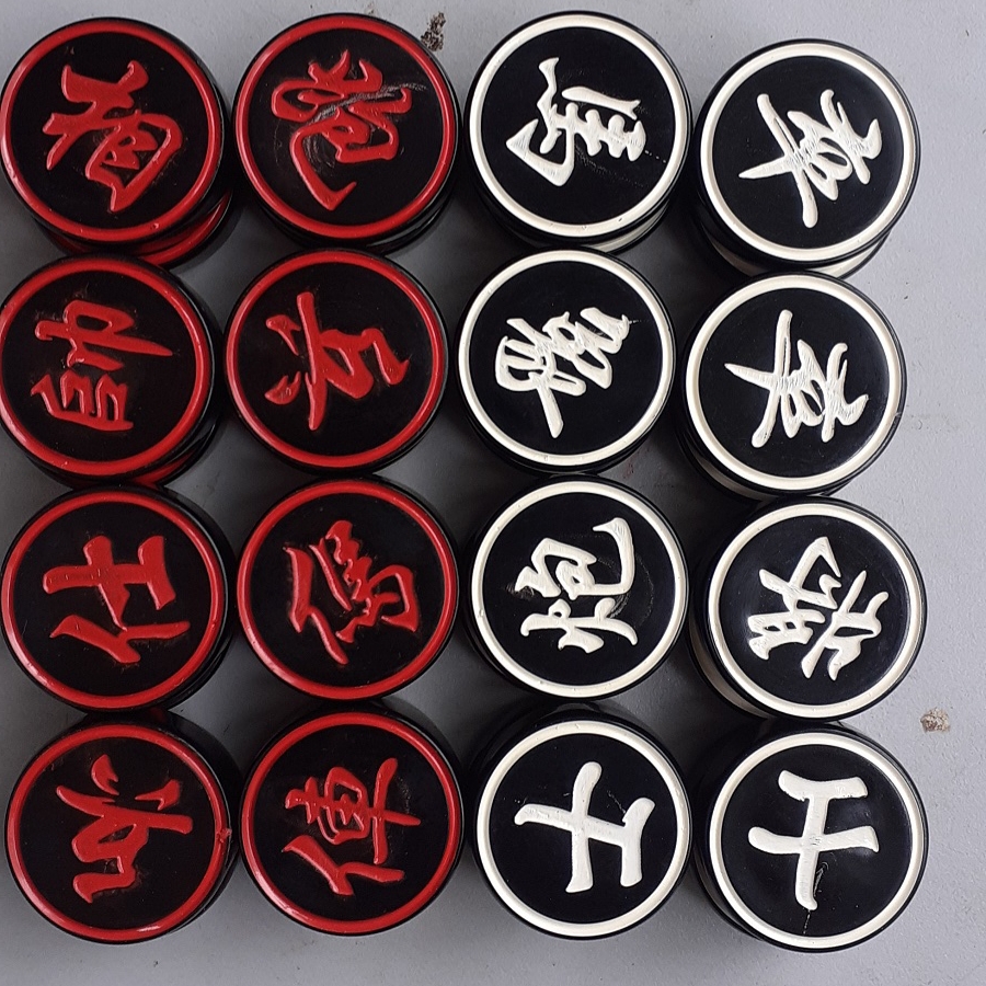 Quân cờ sừng đên hai bên, 16 quân chữ mầu trắng và 16 quân chữ mầu đỏ, quân cờ sừng trâu đen.