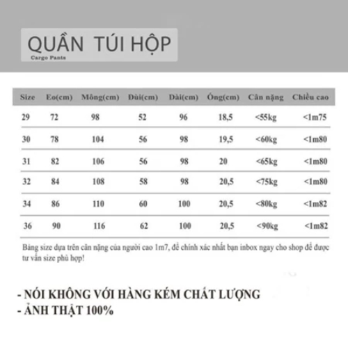 - Chúng tôi cam kết về chất lượng sản phẩm. Size 29: - Lưng: 78cm - Dài: 100cm - Ống 202cm. Cân nặng 45-57kg. Chiều cao 1m50 - 1m60 Size 30: - Lưng: 80cm - Dài: 100cm - Ống 202cm. Cân nặng 58-63kg. Chiều cao 1m65 - 1m70 Size 31: - Lưng: 84cm - Dài: 100cm - Ống 20.52cm. Cân nặng 64-68kg. Chiều cao 1m70 - 1m72 Size 32: - Lưng: 86cm - Dài: 100cm - Ống 20.52cm. Cân nặng 69-74kg. Chiều cao 1m73 - 1m75 Size 34: - Lưng: 90cm - Dài: 100cm - Ống 212cm. Cân nặng 75-80kg. Chiều cao 1m76 - 1m78 Size 36: - Lưng: 94cm - Dài: 100 cm - Ống 212cm. Cân nặng 80-90kg. Chiều cao 1m79 - 1m81 Có size 29-30-32-34-36
