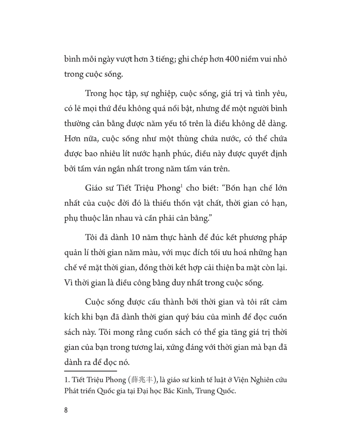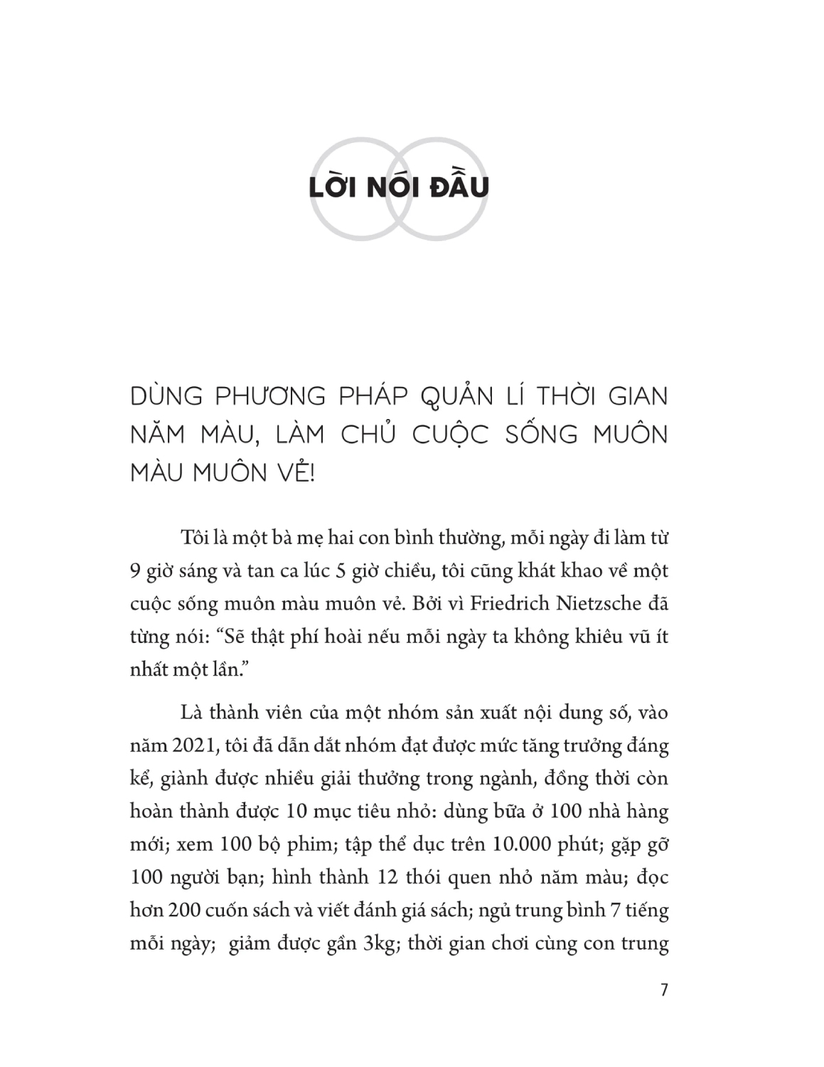 - Quản lí thời gian, đúng, nhưng theo cách độc đáo hơn! Trong học tập, sự nghiệp, cuộc sống, giá trị và tình yêu, có lẽ mọi thứ đều không quá nổi bật, nhưng để một người bình thường cân bằng được năm yếu tố trên là điều không dễ dàng. Hơn nữa, cuộc sống như một thùng chứa nước, có thể chứa được bao nhiêu lít nước hạnh phúc, điều này được quyết định bởi tấm ván ngắn nhất trong năm tấm ván mà bạn sẽ khám phá trong cuốn sách này. Khác với những phương pháp quản lí thời gian trước đó, Quản lí thời gian theo năm màu là một phương pháp đầy màu sắc, có thể khiến bạn say mê và thích thú. Thông qua việc phân bổ và thống kê quản lí thời gian theo năm màu, đó là: màu xanh dương học tập, màu đỏ sự nghiệp, màu xanh lá cuộc sống, màu trắng giá trị và màu vàng tình yêu sẽ giúp bạn tận dụng thời gian một cách có chủ đích. Đồng thời kết nối con người bên trong với thế giới bên ngoài, khai thác năng lượng của bản thân, cảm nhận sự phong phú của cuộc sống và kiểm soát được thời gian mỗi ngày.