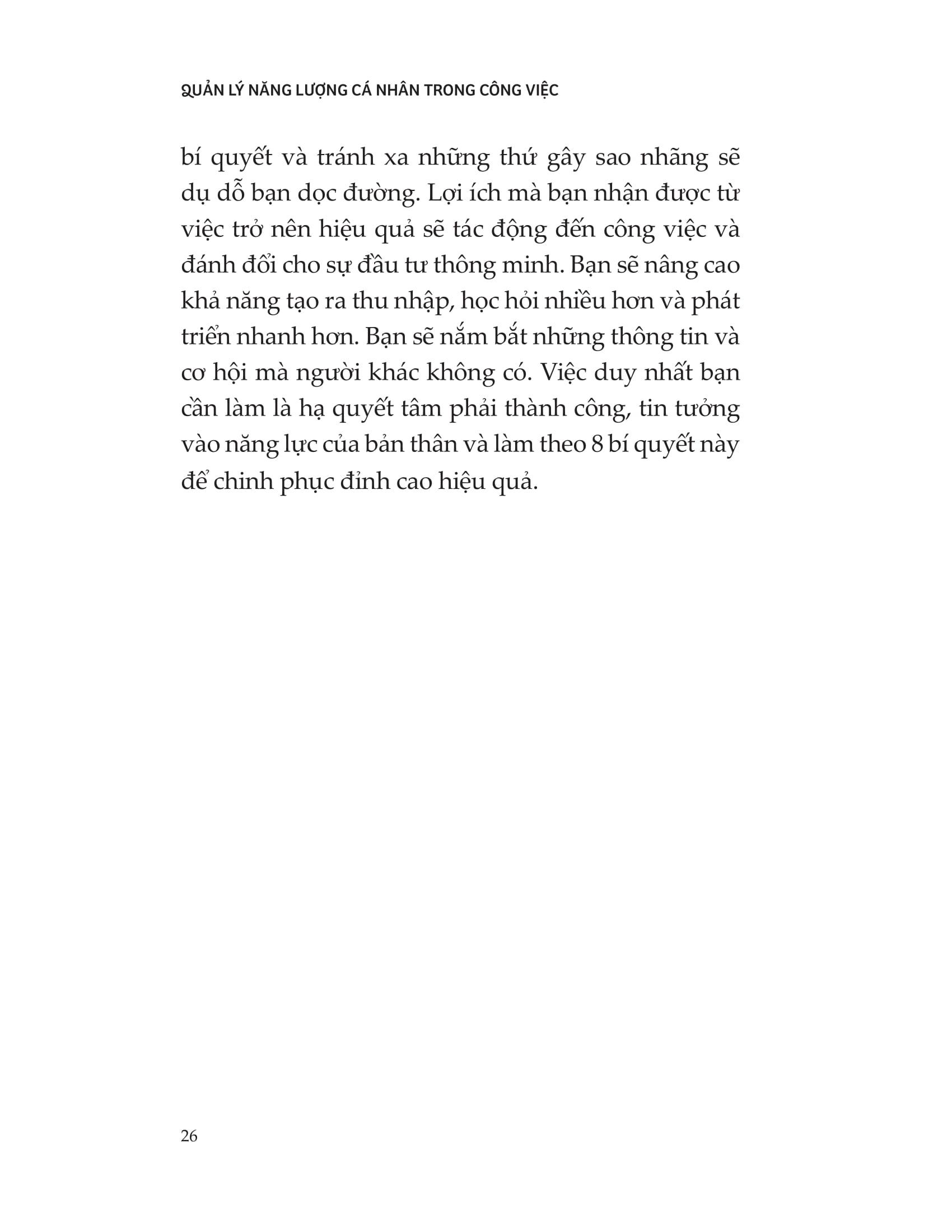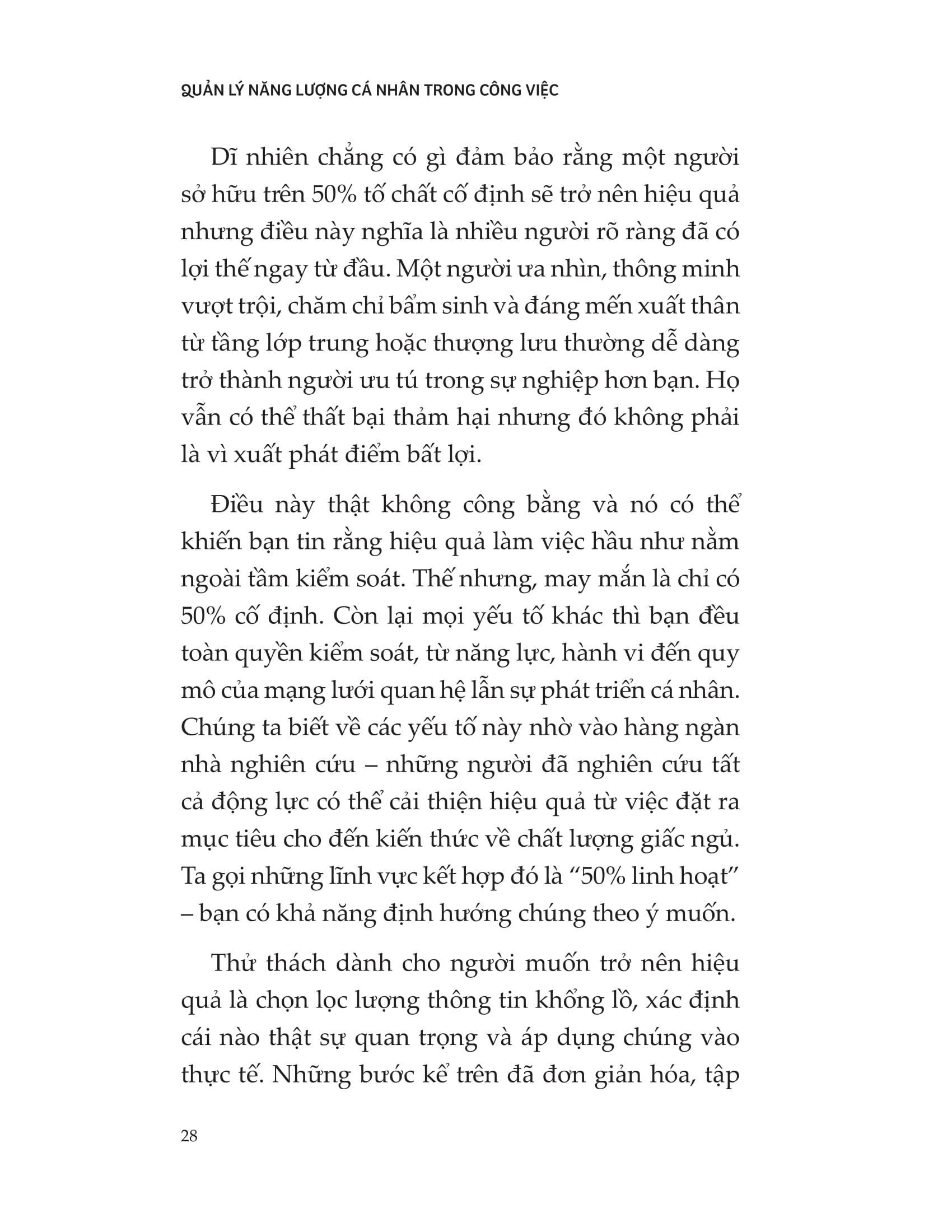 Hiệu suất cao là kết quả của nhiều yếu tố, bao gồm cả mặt tổ chức và cá nhân. Trong đó, điều duy nhất bạn có thể kiểm soát và thay đổi là năng lượng của bản thân: kiên định theo đuổi mục tiêu, tạo sức hút kết nối, tập trung phát triển năng lực hay duy trì thể trạng khỏe mạnh… Cuốn sách “Quản lý năng lượng cá nhân trong công việc” chính là lời giải cho bài toán năng suất với 8 thói quen để duy trì tập trung và nâng cao hiệu suất.