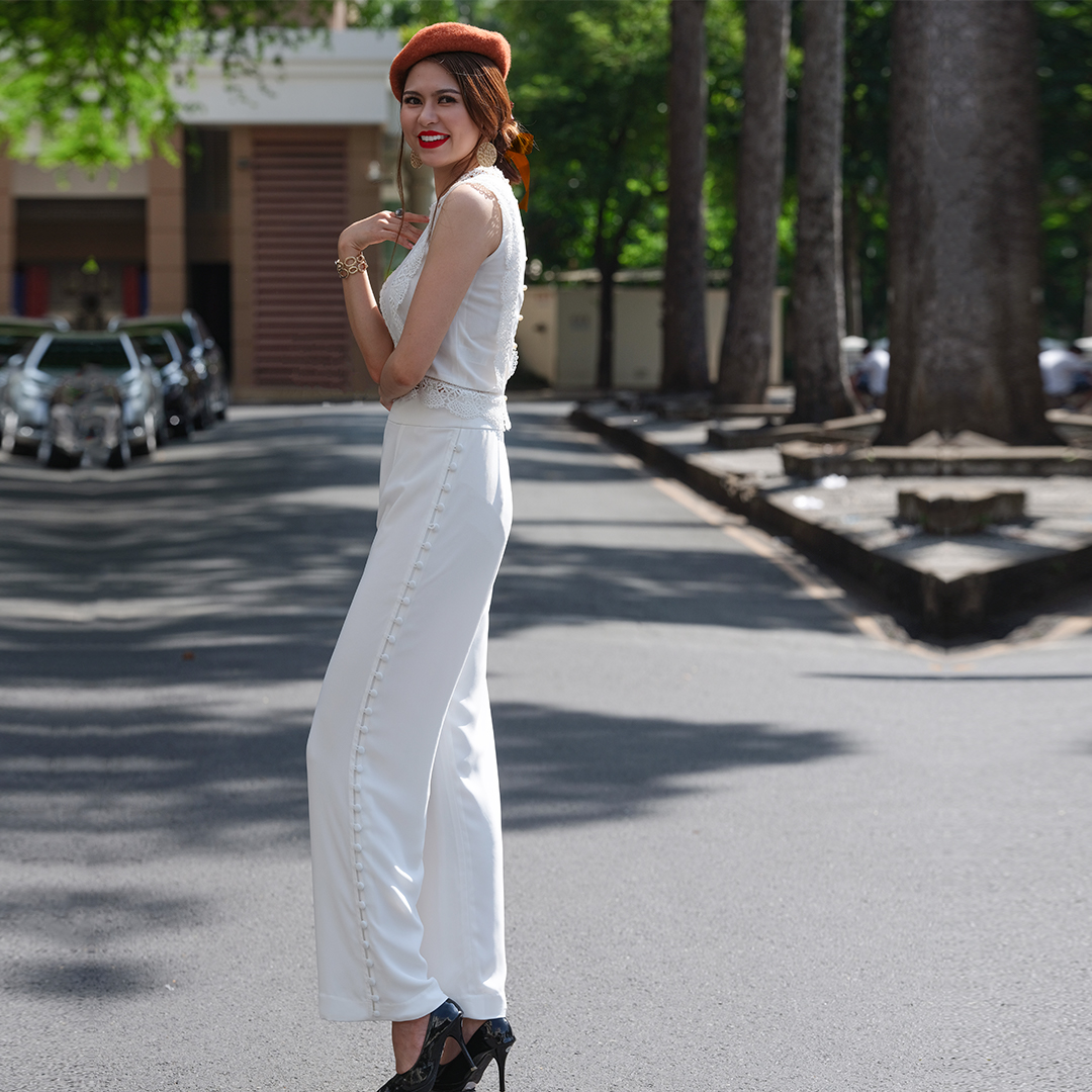 - kiểu dáng quần ống suông - lưng cao, bảng lưng 6cm, cài bằng dây khóa kéo bên hông - đặc biệt nổi bật dù trên nền trắng