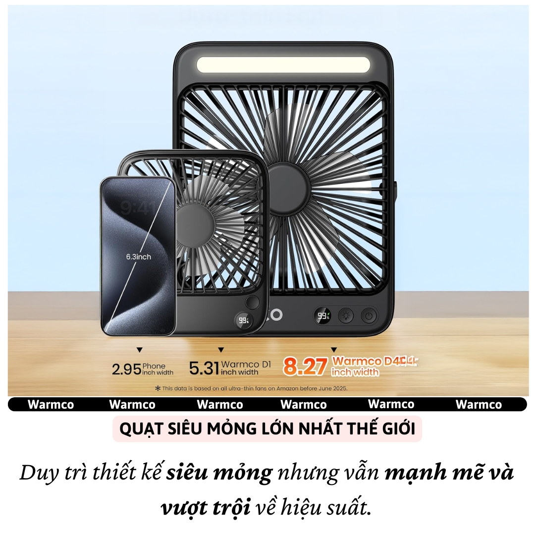 Mua tại TiktokQuạt Sạc Siêu Mỏng Warmco D4 – Pin 20000mAh, Gió Mạnh Êm Ái, Có Đèn LED, Gập Gọn Mang Đi Cắm Trại & Du Lịch Làm mát hiệu quả, sử dụng suốt ngày dài