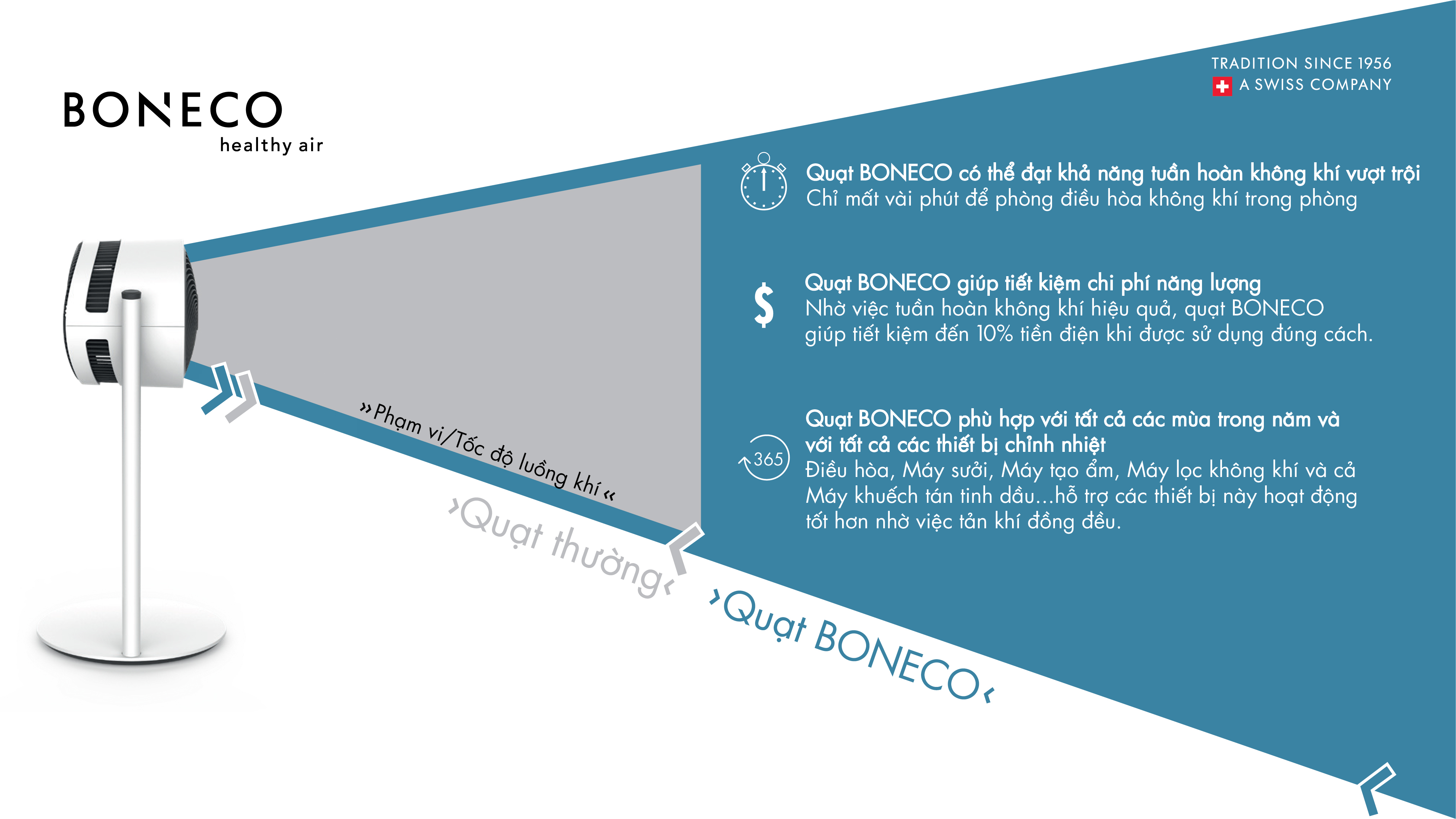 • Điều chỉnh hiệu suất dễ dàng: Quạt đối lưu không khí Boneco F230 được thiết kế với 4 tốc độ, điều chỉnh bằng núm xoay ngay trên thân quạt.   3.TẠI SAO LẠI CHỌN BONECO Trong suốt 60 năm qua, BONECO luôn khẳng định vị thế là thương hiệu cao cấp về giải pháp lọc sạch không khí đến từ Thụy Sĩ (từ 1956). Các sản phẩm của BONECO tiên phong cho chất lượng cao cấp đạt các tiêu chuẩn Châu Âu, công nghệ hiện đại, kiểu dáng sang trọng, chính vì vậy sản phẩm không chỉ mang lại hiệu quả thực sự tốt cho sức khỏe con người mà còn nâng cao chất lượng sống, phong cách sống của người sử dụng.  BONECO đặt trụ sở tại Thụy Sĩ, có nhà máy sản xuất tại Ba Lan, Séc, Mỹ và Trung Quốc cùng hệ thống phân phối trên toàn cầu. BONECO là thương hiệu dẫn đầu thị trường về giải pháp, sản phẩm, ứng dụng tạo độ ẩm và lọc không khí cao cấp. Các sản phẩm của BONECO luôn đảm bảo tiêu chuẩn chất lượng cao nhất từ Châu Âu.   QUẠT ĐIỆN ĐỐI LƯU KHÔNG KHÍ BONECO NHẬP KHẨU TỪ THUỴ SỸ BẢO HÀNH 24 THÁNG - BẢO TRÌ TRỌN ĐỜI MIỄN PHÍ VẬN CHUYỂN TOÀN QUỐC