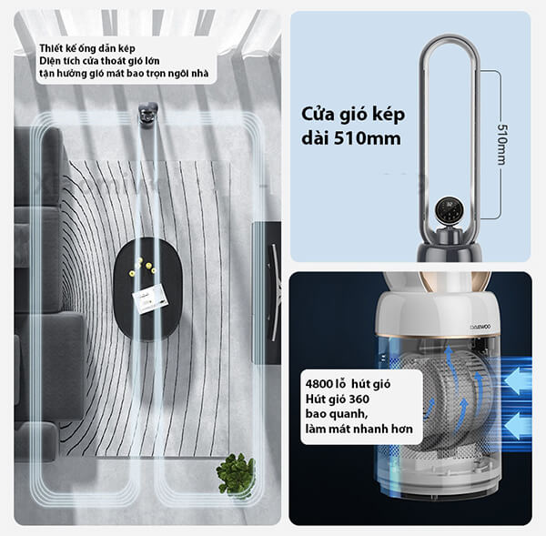 Chức năng kép độc đáo làm mát và sưởi ấm trên cùng một thiết bị - Chức năng làm mát: – Khác với kỹ thuật tạo gió cắt không khí của quạt truyền thống,